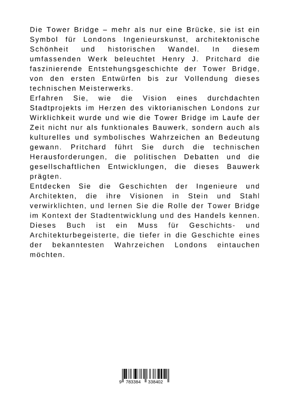 Die Tower Bridge - mehr als nur eine Brücke, sie ist ein Symbol für Londons Ingenieurskunst, architektonische Schönheit und historischen Wandel. In diesem umfassenden Werk beleuchtet Henry J. Pritchard die faszinierende Entstehungsgeschichte der Tower Bridge, von den ersten Entwürfen bis zur Vollendung dieses technischen Meisterwerks.Erfahren Sie, wie die Vision eines durchdachten Stadtprojekts im Herzen des viktorianischen Londons zur Wirklichkeit wurde und wie die Tower Bridge im Laufe der Zeit nicht nur als funktionales Bauwerk, sondern auch als kulturelles und symbolisches Wahrzeichen an Bedeutung gewann. Pritchard führt Sie durch die technischen Herausforderungen, die politischen Debatten und die gesellschaftlichen Entwicklungen, die dieses Bauwerk prägten.Entdecken Sie die Geschichten der Ingenieure und Architekten, die ihre Visionen in Stein und Stahl verwirklichten, und lernen Sie die Rolle der Tower Bridge im Kontext der Stadtentwicklung und des Handels kennen. Dieses Buch ist ein Muss für Geschichts- und Architekturbegeisterte, die tiefer in die Geschichte eines der bekanntesten Wahrzeichen Londons eintauchen möchten.