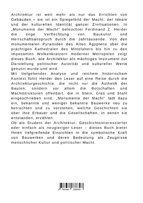 Architektur ist weit mehr als nur das Errichten von Gebäuden - sie ist ein Spiegelbild der Macht, der Ideale und der kulturellen Identität ganzer Zivilisationen. In "Monumente der Macht" beleuchtet Ferdinand Z. Herder die enge Verflechtung von Baukunst und Herrschaftsanspruch durch die Jahrtausende. Von den monumentalen Pyramiden des Alten Ägyptens über die prächtigen Kathedralen des Mittelalters bis hin zu den imposanten Wolkenkratzern moderner Metropolen zeigt dieses Buch, wie Architektur als mächtiges Instrument zur Darstellung politischer Autorität und kultureller Werte genutzt wurde und wird.Mit tiefgehender Analyse und reichem historischem Kontext führt Herder den Leser auf eine Reise durch die Architekturgeschichte, die nicht nur die Ästhetik der Bauten, sondern vor allem die Botschaften und Machtstrukturen offenbart, die in Stein, Glas und Stahl eingeschrieben sind. "Monumente der Macht" lädt dazu ein, bekannte und weniger bekannte Bauwerke neu zu betrachten und zu verstehen, welche Geschichten sie über ihre Erbauer und die Gesellschaften, in denen sie entstanden, erzählen.Ob als Student der Architektur, Geschichtsinteressierter oder einfach als neugieriger Leser - dieses Buch bietet Ihnen tiefgreifende Einsichten in die symbolische Kraft von Bauwerken und deren Bedeutung als Zeugnisse menschlicher Kultur und politischer Macht.