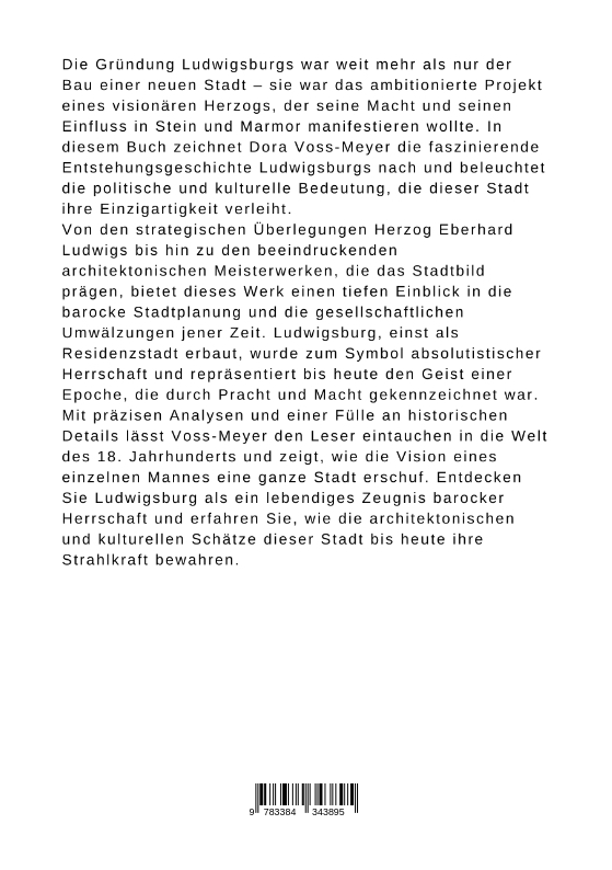 Die Gründung Ludwigsburgs war weit mehr als nur der Bau einer neuen Stadt - sie war das ambitionierte Projekt eines visionären Herzogs, der seine Macht und seinen Einfluss in Stein und Marmor manifestieren wollte. In diesem Buch zeichnet Dora Voss-Meyer die faszinierende Entstehungsgeschichte Ludwigsburgs nach und beleuchtet die politische und kulturelle Bedeutung, die dieser Stadt ihre Einzigartigkeit verleiht.Von den strategischen Überlegungen Herzog Eberhard Ludwigs bis hin zu den beeindruckenden architektonischen Meisterwerken, die das Stadtbild prägen, bietet dieses Werk einen tiefen Einblick in die barocke Stadtplanung und die gesellschaftlichen Umwälzungen jener Zeit. Ludwigsburg, einst als Residenzstadt erbaut, wurde zum Symbol absolutistischer Herrschaft und repräsentiert bis heute den Geist einer Epoche, die durch Pracht und Macht gekennzeichnet war.Mit präzisen Analysen und einer Fülle an historischen Details lässt Voss-Meyer den Leser eintauchen in die Welt des 18. Jahrhunderts und zeigt, wie die Vision eines einzelnen Mannes eine ganze Stadt erschuf. Entdecken Sie Ludwigsburg als ein lebendiges Zeugnis barocker Herrschaft und erfahren Sie, wie die architektonischen und kulturellen Schätze dieser Stadt bis heute ihre Strahlkraft bewahren.