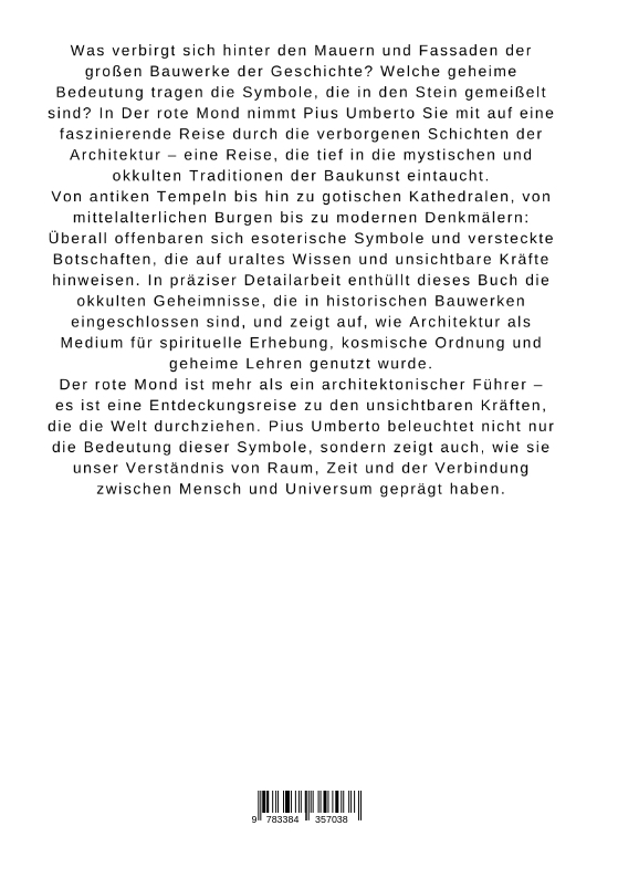 Was verbirgt sich hinter den Mauern und Fassaden der großen Bauwerke der Geschichte? Welche geheime Bedeutung tragen die Symbole, die in den Stein gemeißelt sind? In Der rote Mond nimmt Pius Umberto Sie mit auf eine faszinierende Reise durch die verborgenen Schichten der Architektur - eine Reise, die tief in die mystischen und okkulten Traditionen der Baukunst eintaucht.Von antiken Tempeln bis hin zu gotischen Kathedralen, von mittelalterlichen Burgen bis zu modernen Denkmälern: Überall offenbaren sich esoterische Symbole und versteckte Botschaften, die auf uraltes Wissen und unsichtbare Kräfte hinweisen. In präziser Detailarbeit enthüllt dieses Buch die okkulten Geheimnisse, die in historischen Bauwerken eingeschlossen sind, und zeigt auf, wie Architektur als Medium für spirituelle Erhebung, kosmische Ordnung und geheime Lehren genutzt wurde.Der rote Mond ist mehr als ein architektonischer Führer - es ist eine Entdeckungsreise zu den unsichtbaren Kräften, die die Welt durchziehen. Pius Umberto beleuchtet nicht nur die Bedeutung dieser Symbole, sondern zeigt auch, wie sie unser Verständnis von Raum, Zeit und der Verbindung zwischen Mensch und Universum geprägt haben.
