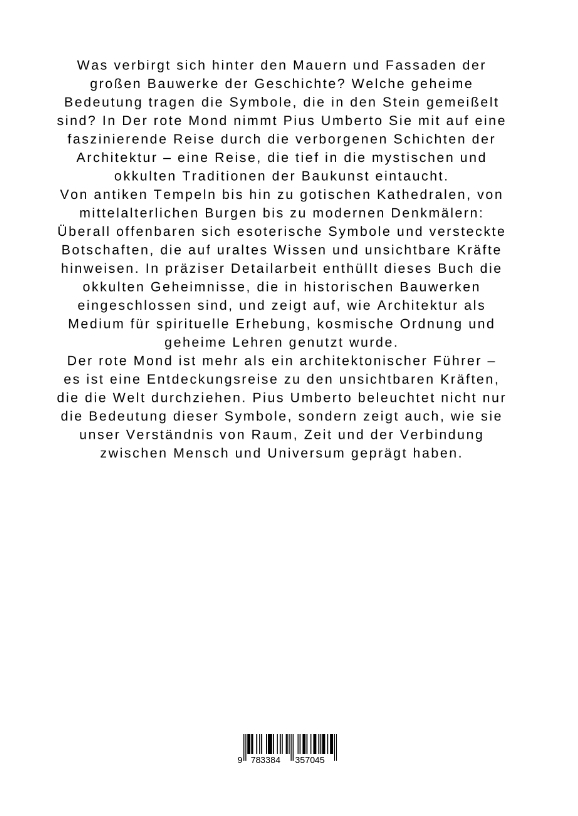 Was verbirgt sich hinter den Mauern und Fassaden der großen Bauwerke der Geschichte? Welche geheime Bedeutung tragen die Symbole, die in den Stein gemeißelt sind? In Der rote Mond nimmt Pius Umberto Sie mit auf eine faszinierende Reise durch die verborgenen Schichten der Architektur - eine Reise, die tief in die mystischen und okkulten Traditionen der Baukunst eintaucht.Von antiken Tempeln bis hin zu gotischen Kathedralen, von mittelalterlichen Burgen bis zu modernen Denkmälern: Überall offenbaren sich esoterische Symbole und versteckte Botschaften, die auf uraltes Wissen und unsichtbare Kräfte hinweisen. In präziser Detailarbeit enthüllt dieses Buch die okkulten Geheimnisse, die in historischen Bauwerken eingeschlossen sind, und zeigt auf, wie Architektur als Medium für spirituelle Erhebung, kosmische Ordnung und geheime Lehren genutzt wurde.Der rote Mond ist mehr als ein architektonischer Führer - es ist eine Entdeckungsreise zu den unsichtbaren Kräften, die die Welt durchziehen. Pius Umberto beleuchtet nicht nur die Bedeutung dieser Symbole, sondern zeigt auch, wie sie unser Verständnis von Raum, Zeit und der Verbindung zwischen Mensch und Universum geprägt haben.