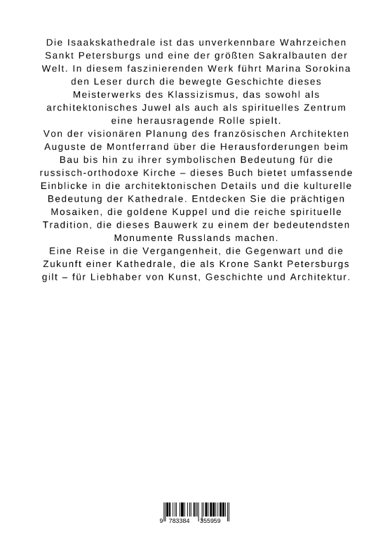 Die Isaakskathedrale ist das unverkennbare Wahrzeichen Sankt Petersburgs und eine der größten Sakralbauten der Welt. In diesem faszinierenden Werk führt Marina Sorokina den Leser durch die bewegte Geschichte dieses Meisterwerks des Klassizismus, das sowohl als architektonisches Juwel als auch als spirituelles Zentrum eine herausragende Rolle spielt.Von der visionären Planung des französischen Architekten Auguste de Montferrand über die Herausforderungen beim Bau bis hin zu ihrer symbolischen Bedeutung für die russisch-orthodoxe Kirche - dieses Buch bietet umfassende Einblicke in die architektonischen Details und die kulturelle Bedeutung der Kathedrale. Entdecken Sie die prächtigen Mosaiken, die goldene Kuppel und die reiche spirituelle Tradition, die dieses Bauwerk zu einem der bedeutendsten Monumente Russlands machen.Eine Reise in die Vergangenheit, die Gegenwart und die Zukunft einer Kathedrale, die als Krone Sankt Petersburgs gilt - für Liebhaber von Kunst, Geschichte und Architektur.