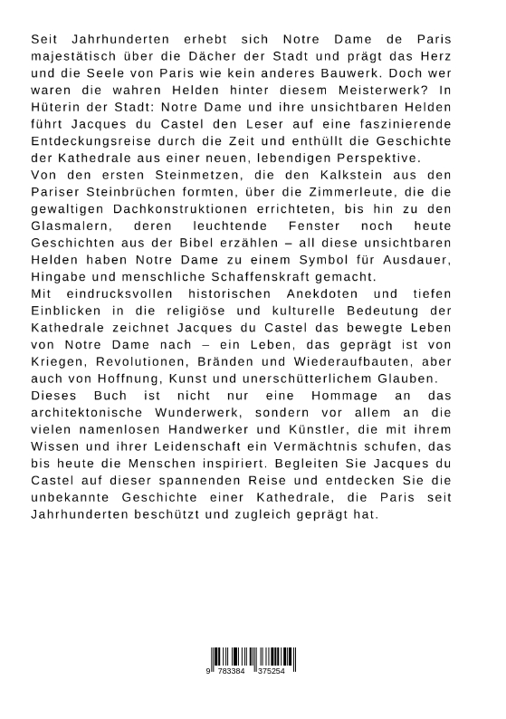 Seit Jahrhunderten erhebt sich Notre Dame de Paris majestätisch über die Dächer der Stadt und prägt das Herz und die Seele von Paris wie kein anderes Bauwerk. Doch wer waren die wahren Helden hinter diesem Meisterwerk? In Hüterin der Stadt: Notre Dame und ihre unsichtbaren Helden führt Jacques du Castel den Leser auf eine faszinierende Entdeckungsreise durch die Zeit und enthüllt die Geschichte der Kathedrale aus einer neuen, lebendigen Perspektive.Von den ersten Steinmetzen, die den Kalkstein aus den Pariser Steinbrüchen formten, über die Zimmerleute, die die gewaltigen Dachkonstruktionen errichteten, bis hin zu den Glasmalern, deren leuchtende Fenster noch heute Geschichten aus der Bibel erzählen - all diese unsichtbaren Helden haben Notre Dame zu einem Symbol für Ausdauer, Hingabe und menschliche Schaffenskraft gemacht.Mit eindrucksvollen historischen Anekdoten und tiefen Einblicken in die religiöse und kulturelle Bedeutung der Kathedrale zeichnet Jacques du Castel das bewegte Leben von Notre Dame nach - ein Leben, das geprägt ist von Kriegen, Revolutionen, Bränden und Wiederaufbauten, aber auch von Hoffnung, Kunst und unerschütterlichem Glauben.Dieses Buch ist nicht nur eine Hommage an das architektonische Wunderwerk, sondern vor allem an die vielen namenlosen Handwerker und Künstler, die mit ihrem Wissen und ihrer Leidenschaft ein Vermächtnis schufen, das bis heute die Menschen inspiriert. Begleiten Sie Jacques du Castel auf dieser spannenden Reise und entdecken Sie die unbekannte Geschichte einer Kathedrale, die Paris seit Jahrhunderten beschützt und zugleich geprägt hat.