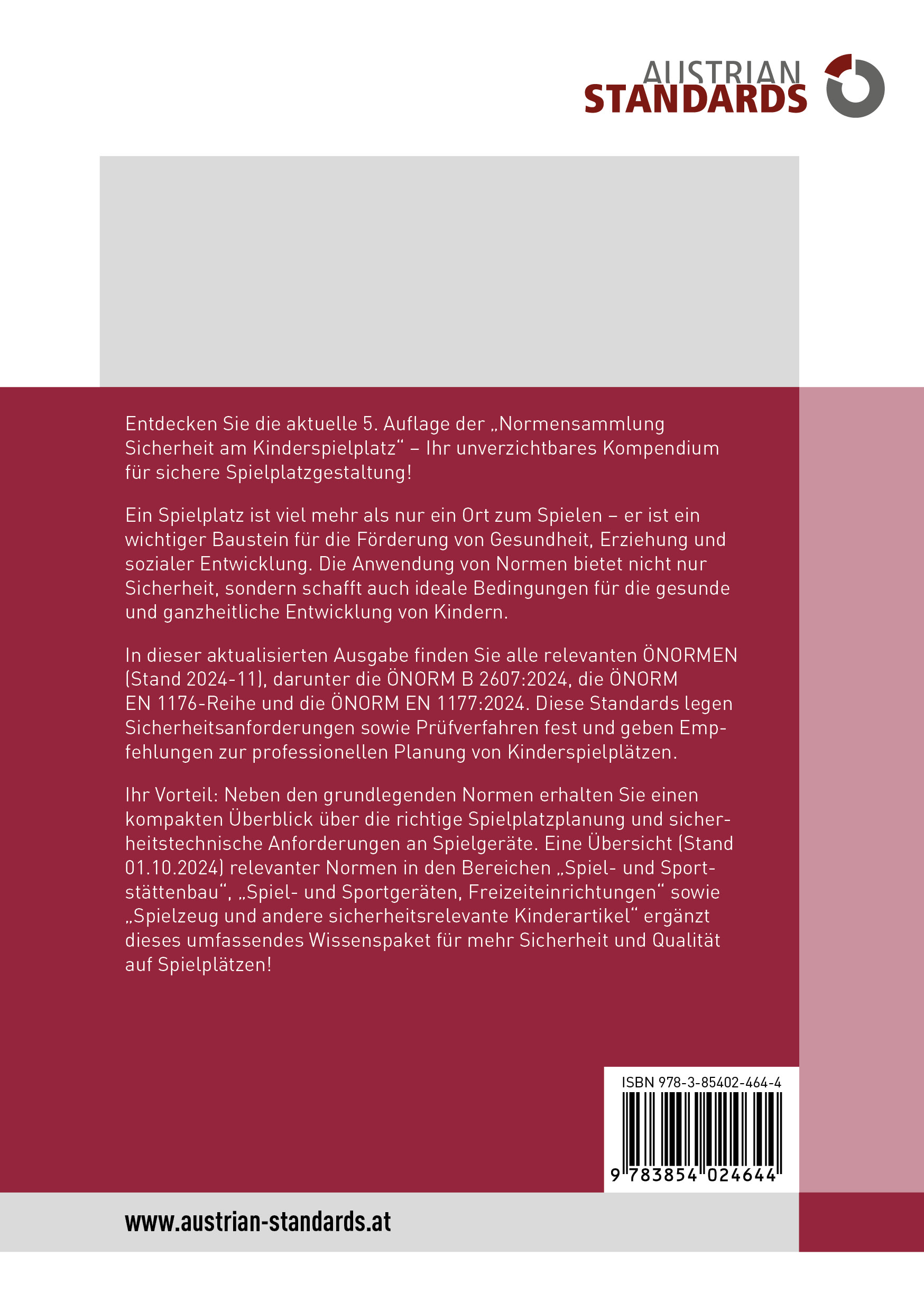 In dieser aktualisierten Ausgabe finden Sie alle relevanten ÖNORMEN (Stand 2024-11), darunter die ÖNORM B 2607:2024, die ÖNORM EN 1176-Reihe und die ÖNORM EN 1177:2024. Diese Standards legen Sicherheitsanforderungen sowie Prüfverfahren fest und geben Empfehlungen zur professionellen Planung von Kinderspielplätzen.