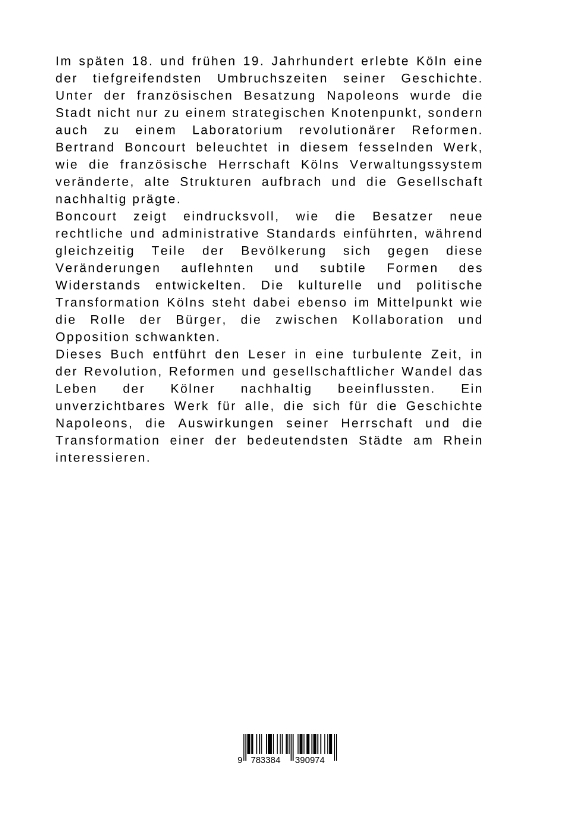Im späten 18. und frühen 19. Jahrhundert erlebte Köln eine der tiefgreifendsten Umbruchszeiten seiner Geschichte. Unter der französischen Besatzung Napoleons wurde die Stadt nicht nur zu einem strategischen Knotenpunkt, sondern auch zu einem Laboratorium revolutionärer Reformen. Bertrand Boncourt beleuchtet in diesem fesselnden Werk, wie die französische Herrschaft Kölns Verwaltungssystem veränderte, alte Strukturen aufbrach und die Gesellschaft nachhaltig prägte.Boncourt zeigt eindrucksvoll, wie die Besatzer neue rechtliche und administrative Standards einführten, während gleichzeitig Teile der Bevölkerung sich gegen diese Veränderungen auflehnten und subtile Formen des Widerstands entwickelten. Die kulturelle und politische Transformation Kölns steht dabei ebenso im Mittelpunkt wie die Rolle der Bürger, die zwischen Kollaboration und Opposition schwankten.Dieses Buch entführt den Leser in eine turbulente Zeit, in der Revolution, Reformen und gesellschaftlicher Wandel das Leben der Kölner nachhaltig beeinflussten. Ein unverzichtbares Werk für alle, die sich für die Geschichte Napoleons, die Auswirkungen seiner Herrschaft und die Transformation einer der bedeutendsten Städte am Rhein interessieren.
