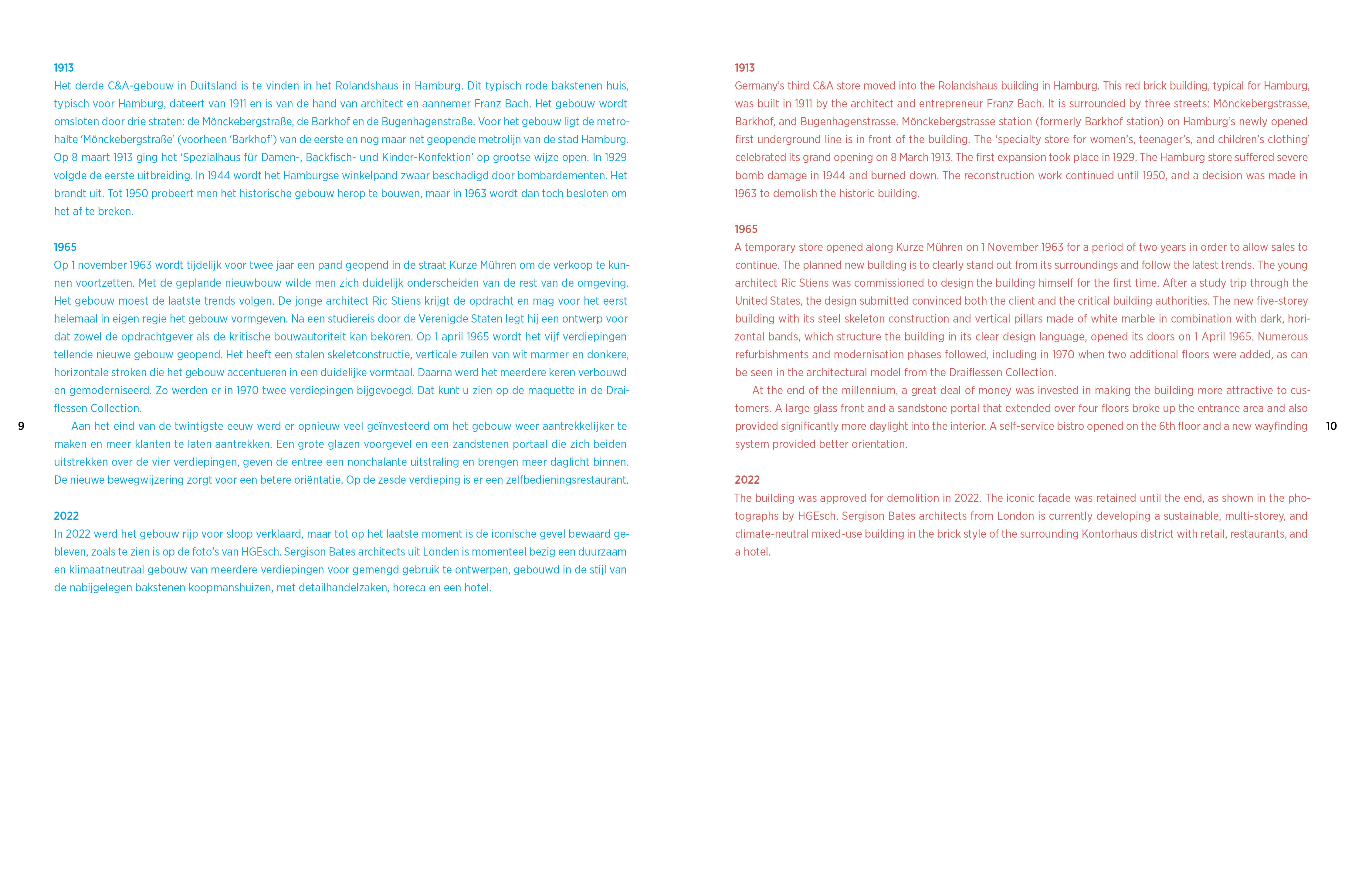 dit boek de geschiedenis van deze winkelpanden weer tot leven en ook de maquettes en de foto’s zelf worden uitvoerig besproken. De architectonische schaalmodellen die grotendeels dateren van de jaren zeventig tot negentig, zijn van de hand van Ric Stiens, een architect uit Essen. De bijdragen van de experts leggen de nadruk op de ontwikkeling van de bouwwerken vanuit verschillende perspectieven en benadrukken hun architectonische belang in het verleden maar ook in het heden. De foto’s van de maquettes en enkele C&A-gebouwen in deze tentoonstellingscatalogus zijn van de hand van de wereldbekende architectuurfotograaf HGEsch. Since the opening of the first building in 1911, C&A stores have shaped the image of German city centres – especially with the new buildings after the Second World War. Using selected examples from the extensive holdings of