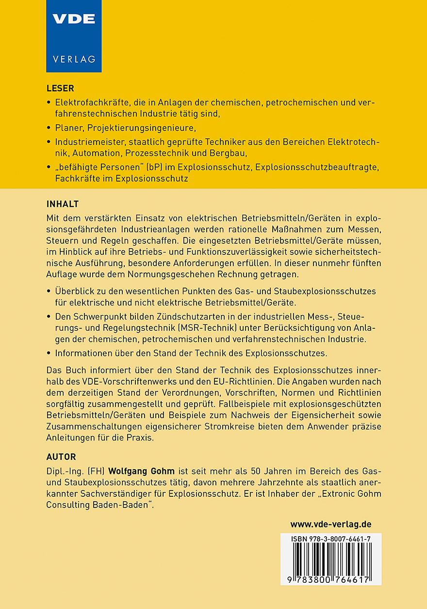 Mit dem verstärkten Einsatz von elektrischen Betriebsmitteln/Geräten in explosionsgefährdeten Industrieanlagen werden rationelle Maßnahmen zum Messen, Steuern und Regeln geschaffen. Die eingesetzten Betriebsmittel/Geräte müssen, im Hinblick auf ihre Betriebs- und Funktionszuverlässigkeit sowie sicherheitstechnische Ausführung, besondere Anforderungen erfüllen. In dieser nunmehr fünften Auflage wurde dem Normungsgeschehen Rechnung getragen.