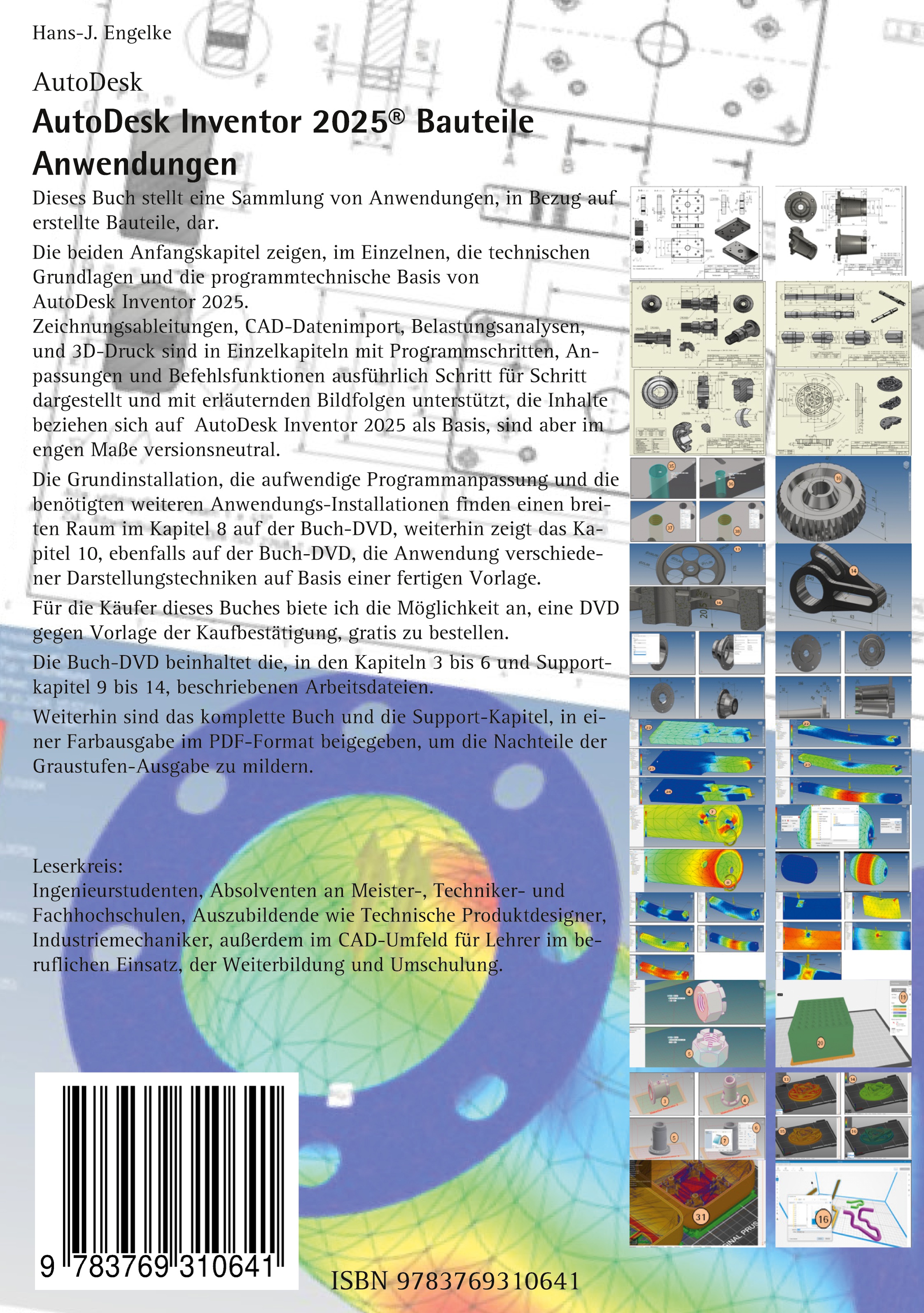 Zeichnungsableitungen, CAD-Datenimport, Belastungsanalysen, und 3D-Druck sind in Einzelkapiteln mit Programmschritten, Anpassungen und Befehlsfunktionen ausführlich Schritt für Schritt dargestellt und mit erläuternden Bildfolgen unterstützt, die Inhalte beziehen sich auf AutoDesk Inventor 2025 als Basis, sind aber im engen Maße versionsneutral.