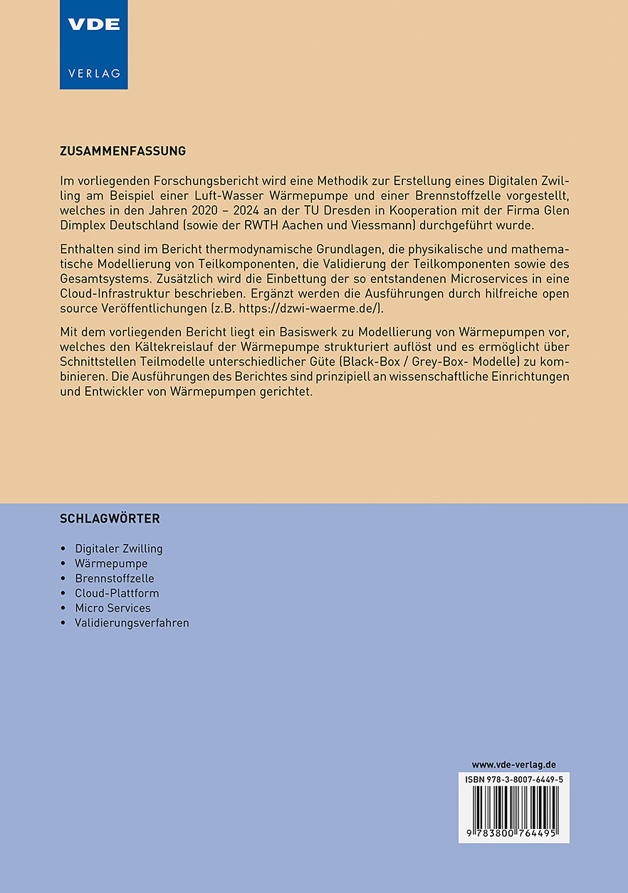 Im vorliegenden Forschungsbericht wird eine Methodik zur Erstellung eines Digitalen Zwilling am Beispiel einer Luft-Wasser Wärmepumpe und einer Brennstoffzelle vorgestellt, welches in den Jahren 2020 - 2024 an der TU Dresden in Kooperation mit der Firma Glen Dimplex Deutschland (sowie der RWTH Aachen und Viessmann) durchgeführt wurde.Enthalten sind im Bericht thermodynamische Grundlagen, die physikalische und mathematische Modellierung von Teilkomponenten, die Validierung der Teilkomponenten sowie des Gesamtsystems. Zusätzlich wird die Einbettung der so entstandenen Microservices in eine Cloud-Infrastruktur beschrieben. Ergänzt werden die Ausführungen durch hilfreiche open source Veröffentlichungen (z.B. https://dzwi-waerme.de/).Mit dem vorliegenden Bericht liegt ein Basiswerk zu Modellierung von Wärmepumpen vor, welches den Kältekreislauf der Wärmepumpe strukturiert auflöst und es ermöglicht über Schnittstellen Teilmodelle unterschiedlicher Güte (Black-Box / Grey-Box-Modelle) zu kombinieren. Die Ausführungen des Berichtes sind prinzipiell an wissenschaftliche Einrichtungen und Entwickler von Wärmepumpen gerichtet.