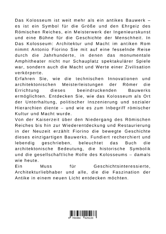 Das Kolosseum ist weit mehr als ein antikes Bauwerk - es ist ein Symbol für die Größe und den Ehrgeiz des Römischen Reiches, ein Meisterwerk der Ingenieurskunst und eine Bühne für die Geschichte der Menschheit. In Das Kolosseum: Architektur und Macht im antiken Rom nimmt Antonio Fiorino Sie mit auf eine fesselnde Reise durch die Jahrhunderte, in denen das monumentale Amphitheater nicht nur Schauplatz spektakulärer Spiele war, sondern auch die Macht und Werte einer Zivilisation verkörperte.Erfahren Sie, wie die technischen Innovationen und architektonischen Meisterleistungen der Römer die Errichtung dieses beeindruckenden Bauwerks ermöglichten. Entdecken Sie, wie das Kolosseum als Ort der Unterhaltung, politischer Inszenierung und sozialer Hierarchien diente - und wie es zum Inbegriff römischer Kultur und Macht wurde.Von der Kaiserzeit über den Niedergang des Römischen Reiches bis hin zur Wiederentdeckung und Restaurierung in der Neuzeit erzählt Fiorino die bewegte Geschichte dieses einzigartigen Bauwerks. Fundiert recherchiert und lebendig geschrieben, beleuchtet das Buch die architektonische Bedeutung, die historische Symbolik und die gesellschaftliche Rolle des Kolosseums - damals wie heute.Ein Muss für Geschichtsinteressierte, Architekturliebhaber und alle, die die Faszination der Antike in einem neuen Licht entdecken möchten.