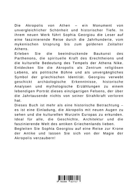 Die Akropolis von Athen - ein Monument von unvergleichlicher Schönheit und historischer Tiefe. In ihrem neuen Werk führt Sophia Georgiou die Leser auf eine faszinierende Reise durch die Jahrhunderte, vom mykenischen Ursprung bis zum goldenen Zeitalter Athens.Erleben Sie die beeindruckende Baukunst des Parthenons, die spirituelle Kraft des Erechtheions und die kulturelle Bedeutung des Tempels der Athena Nike. Entdecken Sie die Akropolis als Zentrum religiösen Lebens, als politische Bühne und als unvergängliches Symbol der griechischen Identität. Georgiou verwebt geschickt archäologische Erkenntnisse, historische Analysen und mythologische Erzählungen zu einem lebendigen Porträt dieses einzigartigen Felsens, der über die Jahrtausende nichts von seiner Strahlkraft verloren hat.Dieses Buch ist mehr als eine historische Betrachtung - es ist eine Einladung, die Akropolis mit neuen Augen zu sehen und die kulturellen Wurzeln Europas zu erkunden. Ideal für alle, die Geschichte, Architektur und die faszinierende Welt des antiken Griechenlands lieben.Begleiten Sie Sophia Georgiou auf eine Reise zur Krone der Antike und lassen Sie sich von der Magie der Akropolis verzaubern!