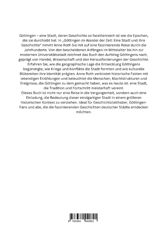 Göttingen - eine Stadt, deren Geschichte so facettenreich ist wie die Epochen, die sie durchlebt hat. In "Göttingen im Wandel der Zeit: Eine Stadt und ihre Geschichte" nimmt Anne Roth Sie mit auf eine faszinierende Reise durch die Jahrhunderte. Von den bescheidenen Anfängen im Mittelalter bis hin zur modernen Universitätsstadt zeichnet das Buch den Aufstieg Göttingens nach, geprägt von Handel, Wissenschaft und den Herausforderungen der Geschichte.Erfahren Sie, wie die geographische Lage die Entwicklung Göttingens begünstigte, wie Kriege und Konflikte die Stadt formten und wie kulturelle Blütezeiten ihre Identität prägten. Anne Roth verbindet historische Fakten mit lebendigen Erzählungen und beleuchtet die Menschen, Machtstrukturen und Ereignisse, die Göttingen zu dem gemacht haben, was es heute ist: eine Stadt, die Tradition und Fortschritt meisterhaft vereint.Dieses Buch ist nicht nur eine Reise in die Vergangenheit, sondern auch eine Einladung, die Bedeutung dieser einzigartigen Stadt in einem größeren historischen Kontext zu verstehen. Ideal für Geschichtsliebhaber, Göttingen-Fans und alle, die die faszinierenden Geschichten deutscher Städte entdecken möchten.