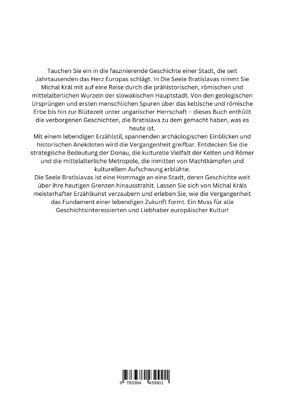 Tauchen Sie ein in die faszinierende Geschichte einer Stadt, die seit Jahrtausenden das Herz Europas schlägt. In Die Seele Bratislavas nimmt Sie Michal Král mit auf eine Reise durch die prähistorischen, römischen und mittelalterlichen Wurzeln der slowakischen Hauptstadt. Von den geologischen Ursprüngen und ersten menschlichen Spuren über das keltische und römische Erbe bis hin zur Blütezeit unter ungarischer Herrschaft - dieses Buch enthüllt die verborgenen Geschichten, die Bratislava zu dem gemacht haben, was es heute ist.Mit einem lebendigen Erzählstil, spannenden archäologischen Einblicken und historischen Anekdoten wird die Vergangenheit greifbar. Entdecken Sie die strategische Bedeutung der Donau, die kulturelle Vielfalt der Kelten und Römer und die mittelalterliche Metropole, die inmitten von Machtkämpfen und kulturellem Aufschwung erblühte.Die Seele Bratislavas ist eine Hommage an eine Stadt, deren Geschichte weit über ihre heutigen Grenzen hinausstrahlt. Lassen Sie sich von Michal Králs meisterhafter Erzählkunst verzaubern und erleben Sie, wie die Vergangenheit das Fundament einer lebendigen Zukunft formt. Ein Muss für alle Geschichtsinteressierten und Liebhaber europäischer Kultur!