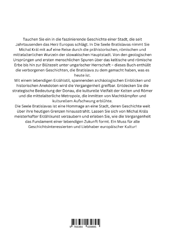 Tauchen Sie ein in die faszinierende Geschichte einer Stadt, die seit Jahrtausenden das Herz Europas schlägt. In Die Seele Bratislavas nimmt Sie Michal Král mit auf eine Reise durch die prähistorischen, römischen und mittelalterlichen Wurzeln der slowakischen Hauptstadt. Von den geologischen Ursprüngen und ersten menschlichen Spuren über das keltische und römische Erbe bis hin zur Blütezeit unter ungarischer Herrschaft - dieses Buch enthüllt die verborgenen Geschichten, die Bratislava zu dem gemacht haben, was es heute ist.Mit einem lebendigen Erzählstil, spannenden archäologischen Einblicken und historischen Anekdoten wird die Vergangenheit greifbar. Entdecken Sie die strategische Bedeutung der Donau, die kulturelle Vielfalt der Kelten und Römer und die mittelalterliche Metropole, die inmitten von Machtkämpfen und kulturellem Aufschwung erblühte.Die Seele Bratislavas ist eine Hommage an eine Stadt, deren Geschichte weit über ihre heutigen Grenzen hinausstrahlt. Lassen Sie sich von Michal Králs meisterhafter Erzählkunst verzaubern und erleben Sie, wie die Vergangenheit das Fundament einer lebendigen Zukunft formt. Ein Muss für alle Geschichtsinteressierten und Liebhaber europäischer Kultur!