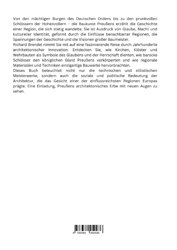 Von den mächtigen Burgen des Deutschen Ordens bis zu den prunkvollen Schlössern der Hohenzollern - die Baukunst Preußens erzählt die Geschichte einer Region, die sich stetig wandelte. Sie ist Ausdruck von Glaube, Macht und kultureller Identität, geformt durch die Einflüsse benachbarter Regionen, die Spannungen der Geschichte und die Visionen großer Baumeister.Richard Brendel nimmt Sie mit auf eine faszinierende Reise durch Jahrhunderte architektonischer Innovation. Entdecken Sie, wie Kirchen, Klöster und Wehrbauten als Symbole des Glaubens und der Herrschaft dienten, wie barocke Schlösser den königlichen Glanz Preußens verkörperten und wie regionale Materialien und Techniken einzigartige Bauwerke hervorbrachten.Dieses Buch beleuchtet nicht nur die technischen und stilistischen Meisterwerke, sondern auch die soziale und politische Bedeutung der Architektur, die das Gesicht einer der einflussreichsten Regionen Europas prägte. Eine Einladung, Preußens architektonisches Erbe mit neuen Augen zu sehen.