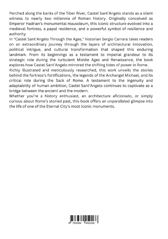 Perched along the banks of the Tiber River, Castel Sant'Angelo stands as a silent witness to nearly two millennia of Roman history. Originally conceived as Emperor Hadrian's monumental mausoleum, this iconic structure evolved into a medieval fortress, a papal residence, and a powerful symbol of resilience and authority.In "Castel Sant'Angelo Through the Ages," historian Sergio Carrara takes readers on an extraordinary journey through the layers of architectural innovation, political intrigue, and cultural transformation that shaped this enduring landmark. From its beginnings as a testament to imperial grandeur to its strategic role during the turbulent Middle Ages and Renaissance, the book explores how Castel Sant'Angelo mirrored the shifting tides of power in Rome.Richly illustrated and meticulously researched, this work unveils the stories behind the fortress's fortifications, the legends of the Archangel Michael, and its critical role during the Sack of Rome. A testament to the ingenuity and adaptability of human ambition, Castel Sant'Angelo continues to captivate as a bridge between the ancient and the modern.Whether you're a history enthusiast, an architecture aficionado, or simply curious about Rome's storied past, this book offers an unparalleled glimpse into the life of one of the Eternal City's most iconic monuments.