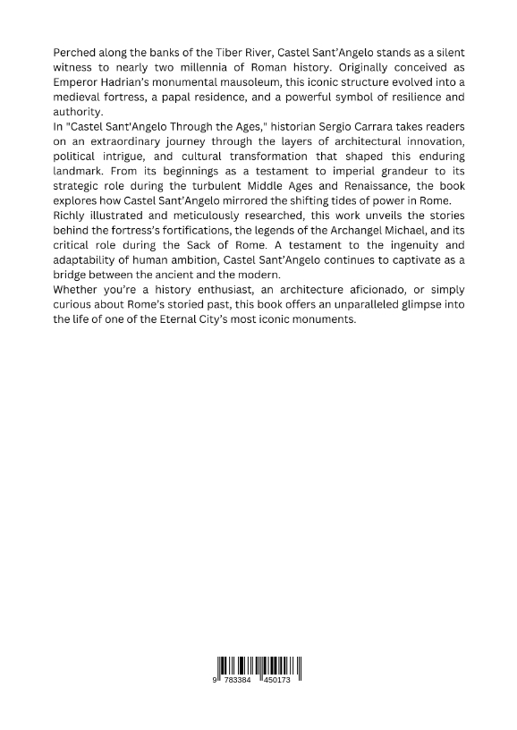 Perched along the banks of the Tiber River, Castel Sant'Angelo stands as a silent witness to nearly two millennia of Roman history. Originally conceived as Emperor Hadrian's monumental mausoleum, this iconic structure evolved into a medieval fortress, a papal residence, and a powerful symbol of resilience and authority.In "Castel Sant'Angelo Through the Ages," historian Sergio Carrara takes readers on an extraordinary journey through the layers of architectural innovation, political intrigue, and cultural transformation that shaped this enduring landmark. From its beginnings as a testament to imperial grandeur to its strategic role during the turbulent Middle Ages and Renaissance, the book explores how Castel Sant'Angelo mirrored the shifting tides of power in Rome.Richly illustrated and meticulously researched, this work unveils the stories behind the fortress's fortifications, the legends of the Archangel Michael, and its critical role during the Sack of Rome. A testament to the ingenuity and adaptability of human ambition, Castel Sant'Angelo continues to captivate as a bridge between the ancient and the modern.Whether you're a history enthusiast, an architecture aficionado, or simply curious about Rome's storied past, this book offers an unparalleled glimpse into the life of one of the Eternal City's most iconic monuments.