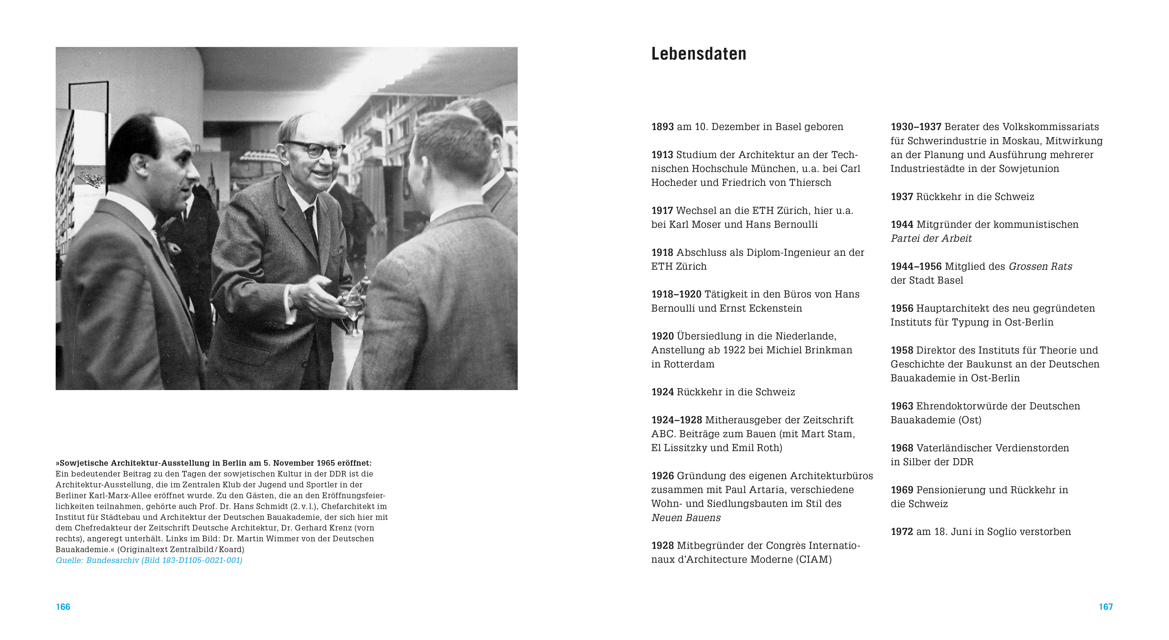 Hans Schmidt, geb. 1893 in Basel, Architekt, Stadtplaner und Architekturtheoretiker war ein Vorreiter des Neuen Bauens in der Schweiz und Mitbegründer des CIAM, bevor er 1930 für sieben Jahre als Spezialist in die UdSSR übersiedelte. Dort setzte er seine Arbeit an Kleinstwohnungen und seriellen Planungen fort. 1956 startete Schmidt in der DDR eine weitere Karriere an der Deutschen Baukademie. Zu seinen Aufgaben gehörten die Standardisierung des Wohnungsbaus und die Entwicklung von Typenbauten. 1969 kehrte der Schweizer Kommunist in seine Heimat zurück und verstarb dort 1972.