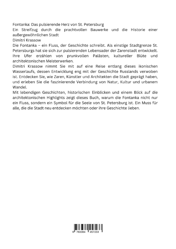 Die Fontanka - ein Fluss, der Geschichte schreibt. Als einstige Stadtgrenze St. Petersburgs hat sie sich zur pulsierenden Lebensader der Zarenstadt entwickelt. Ihre Ufer erzählen von prunkvollen Palästen, kultureller Blüte und architektonischen Meisterwerken.Dimitri Krassow nimmt Sie mit auf eine Reise entlang dieses ikonischen Wasserlaufs, dessen Entwicklung eng mit der Geschichte Russlands verwoben ist. Entdecken Sie, wie Zaren, Künstler und Architekten die Stadt geprägt haben, und erleben Sie die faszinierende Verbindung von Natur, Kultur und urbanem Wandel.Mit lebendigen Geschichten, historischen Einblicken und einem Blick auf die architektonischen Highlights zeigt dieses Buch, warum die Fontanka nicht nur ein Fluss, sondern ein Symbol für die Seele von St. Petersburg ist. Ein Muss für alle, die die Stadt neu entdecken möchten oder ihre Geschichte lieben.