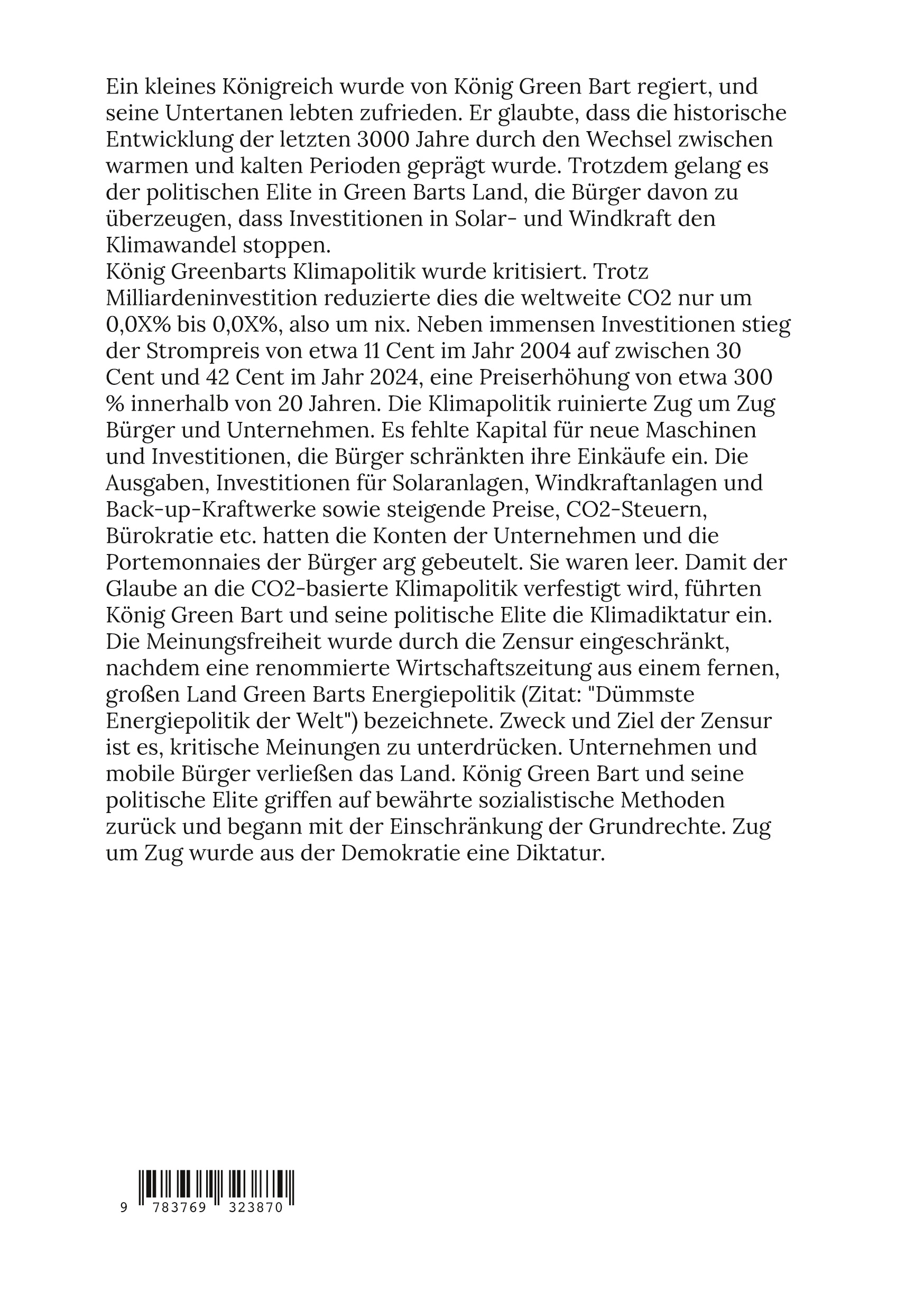 Damit der Glaube an die CO2-basierte Klimapolitik verfestigt wird, führten König Green Bart und seine politische Elite die Klimadiktatur ein. Die Meinungsfreiheit wurde durch die Zensur eingeschränkt, nachdem eine renommierte Wirtschaftszeitung aus einem fernen, großen Land Green Barts Energiepolitik (Zitat: "Dümmste Energiepolitik der Welt") bezeichnete. Zweck und Ziel der Zensur ist es, kritische Meinungen zu unterdrücken der Bürger zu unterdrücken. Unternehmen und mobile Bürger verließen das Land. König Green Bart und seine politische Elite griffen auf bewährte sozialistische Methoden zurück und begann mit der Einschränkung der Grundrechte. Zug um Zug wurde aus der Demokratie eine Klimadiktatur.
