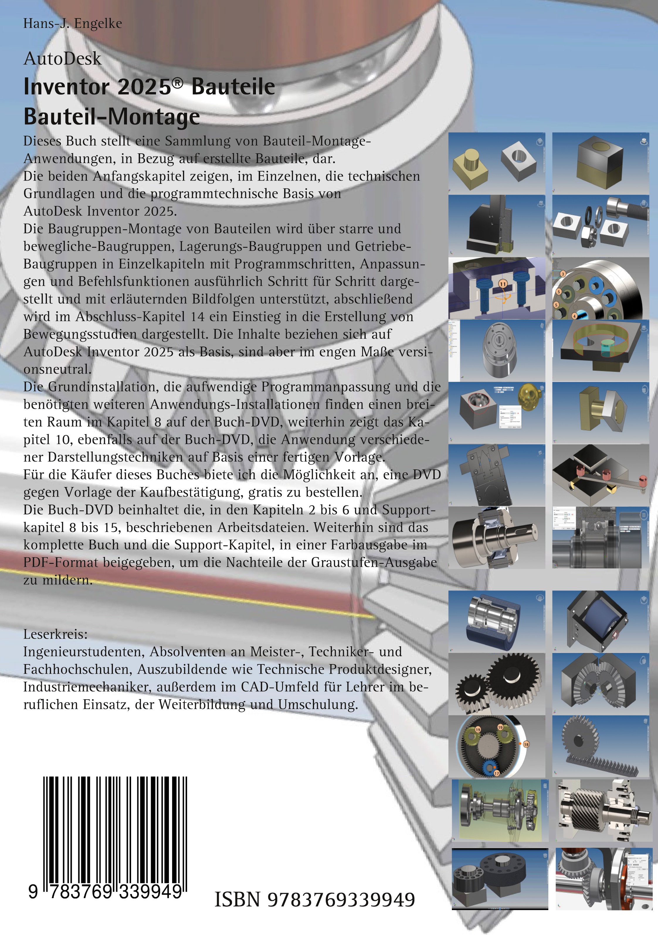 Die Baugruppen-Montage von Bauteilen wird über starre und bewegliche-Baugruppen, Lagerungs-Baugruppen und Getriebe-Baugruppen in Einzelkapiteln mit Programmschritten, Anpassungen und Befehlsfunktionen ausführlich Schritt für Schritt dargestellt und mit erläuternden Bildfolgen unterstützt, abschließend wird im Abschluss-Kapitel 15 ein Einstieg in die Erstellung von Bewegungsstudien dargestellt. Die Inhalte beziehen sich auf AutoDesk Inventor 2025 als Basis, sind aber im engen Maße versionsneutral.