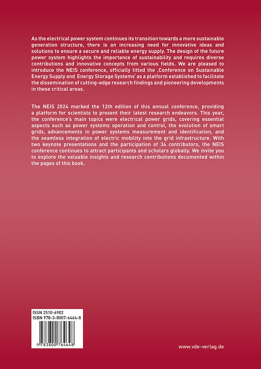 The annual NEIS conference is hosted by the chair of Electrical Power Systems of the Helmut Schmidt University in Hamburg. Since 2013 it provides a forum for scientists and experts to discuss prospective and recent developments in the fields of energy supply and energy storage technologies.This year's conference continues to focus on electrical power grids and grid-related aspects, including load management, power system measurements and identification techniques, energy storage systems, and the integration of electric mobility into the grid.