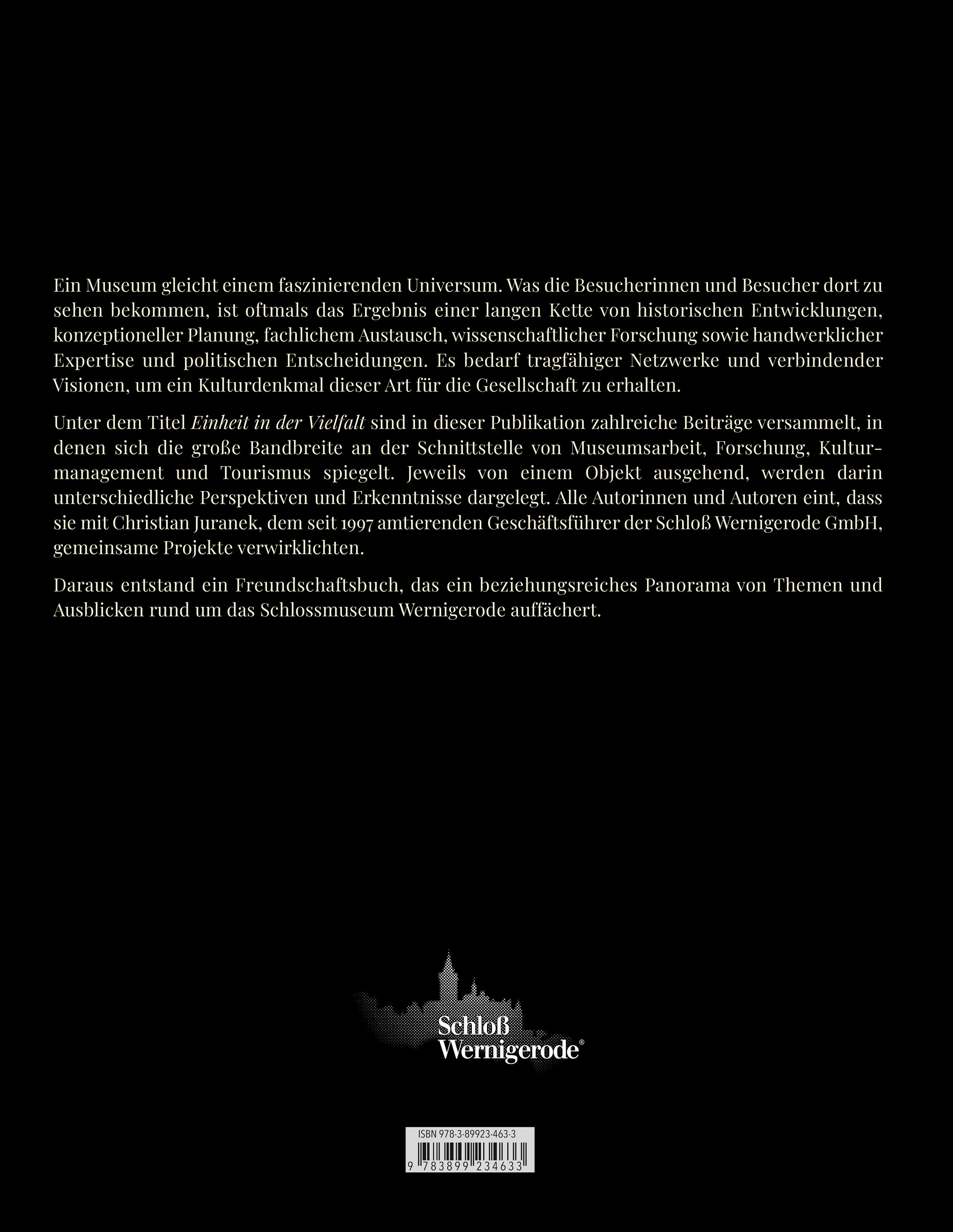 Unter dem Titel Einheit in der Vielfalt sind in dieser Publikation zahlreiche Beiträge versammelt, in denen sich die große Bandbreite an der Schnittstelle von Museumsarbeit, Forschung, Kulturmanagement und Tourismus spiegelt. Jeweils von einem Objekt ausgehend, werden darin unterschiedliche Perspektiven und Erkenntnisse dargelegt. Alle Autorinnen und Autoren eint, dass sie mit Christian Juranek, dem seit 1997 amtierenden Geschäftsführer der Schloß Wernigerode GmbH, gemeinsame Projekte verwirklichten. Inhaltsverzeichnis