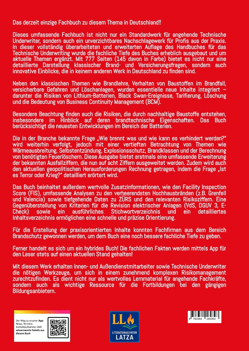 Das derzeit einzige Fachbuch zu diesem Thema in Deutschland!!Dieses umfassende Fachbuch ist nicht nur ein Standardwerk für angehende Technische Underwriter, sondern auch ein unverzichtbares Nachschlagewerk für Profis aus der Praxis. In dieser vollständig überarbeiteten und erweiterten Auflage wurde die fachliche Tiefe des Buches erheblich ausgebaut und um bahnbrechende, aktuelle Themen ergänzt. Mit über 700 Seiten bietet es nicht nur eine detaillierte Darstellung klassischer Brand- und Versicherungsfragen, sondern auch innovative Einblicke, die in keinem anderen Werk in Deutschland zu finden sind.Neben den klassischen Themen wie Brandlehre, Verhalten von Baustoffen im Brandfall, versicherbare Gefahren und Löschanlagen, wurden essentielle neue Inhalte integriert - darunter die Risiken von Lithium-Batterien, Black Swan-Ereignisse, Tarifierung, Löschung und die Bedeutung von Business Continuity Management (BCM).Besondere Beachtung finden auch die Risiken, die durch nachhaltige Baustoffe entstehen, insbesondere im Hinblick auf deren brandtechnische Eigenschaften. Das Buch berücksichtigt die neuesten Entwicklungen in der Metallurgie, wie z.B. die Behandlung von hochgradig feuergefährlichen Materialien, und deren Einfluss auf die Versicherbarkeit.Die in der Branche bekannte Frage "Wie brennt was und wie kann es verhindert werden?" wird weiterhin verfolgt, jedoch mit einer vertieften Betrachtung von Themen wie Wärmeausbreitung, Selbstentzündung, Explosionsschutz, Brandklassen und der Berechnung von benötigten Feuerlöschern. Diese Ausgabe bietet erstmals eine umfassende Erweiterung der bekannten Ausfallziffern, die nun auf acht Ziffern ausgeweitet werden. Zudem wird auch den aktuellen geopolitischen Herausforderungen Rechnung getragen, indem die Frage "Ist es Terror oder Krieg?" detailliert erörtert wird.Das Buch beinhaltet außerdem wertvolle Zusatzinformationen, wie den Facility Inspection Score (FIS), umfassende Analysen zu den verheerendsten Hochhausbränden (z.B. Grenfell und Valencia) sowie tiefgehende Daten zu ZÜRS und den relevanten Risikoziffern. Eine Gegenüberstellung von Kriterien für die Revision elektrischer Anlagen (VdS, DGUV 3, E-Check) sowie ein ausführliches Stichwortverzeichnis und ein detailliertes Inhaltsverzeichnis ermöglichen eine schnelle und präzise Orientierung.Für die Erstellung der praxisorientierten Inhalte konnten Fachfirmen aus dem Bereich Brandschutz gewonnen werden, um dem Buch eine noch bessere fachliche Tiefe zu geben.Ferner handelt es sich um ein hybrides Buch! Die fachlichen Fakten werden mittels App für den Leser stets auf einen aktuellen Stand gehalten!Mit diesem Werk erhalten Innen- und Außendienstmitarbeiter sowie Technische Underwriter (DVA) die nötigen Werkzeuge, um sich in einem zunehmend komplexen Risikomanagement zurechtzufinden. Es dient nicht nur als wertvolles Lernmaterial für angehende Fachkräfte, sondern auch als wichtige Ressource für die Fortbildung in der VEMA-Akademie, der Deutschen Makler Akademie (DMA) und der Akademie des Bundesverbands der Sachverständigen für das Versicherungswesen e.V. (BVSV).