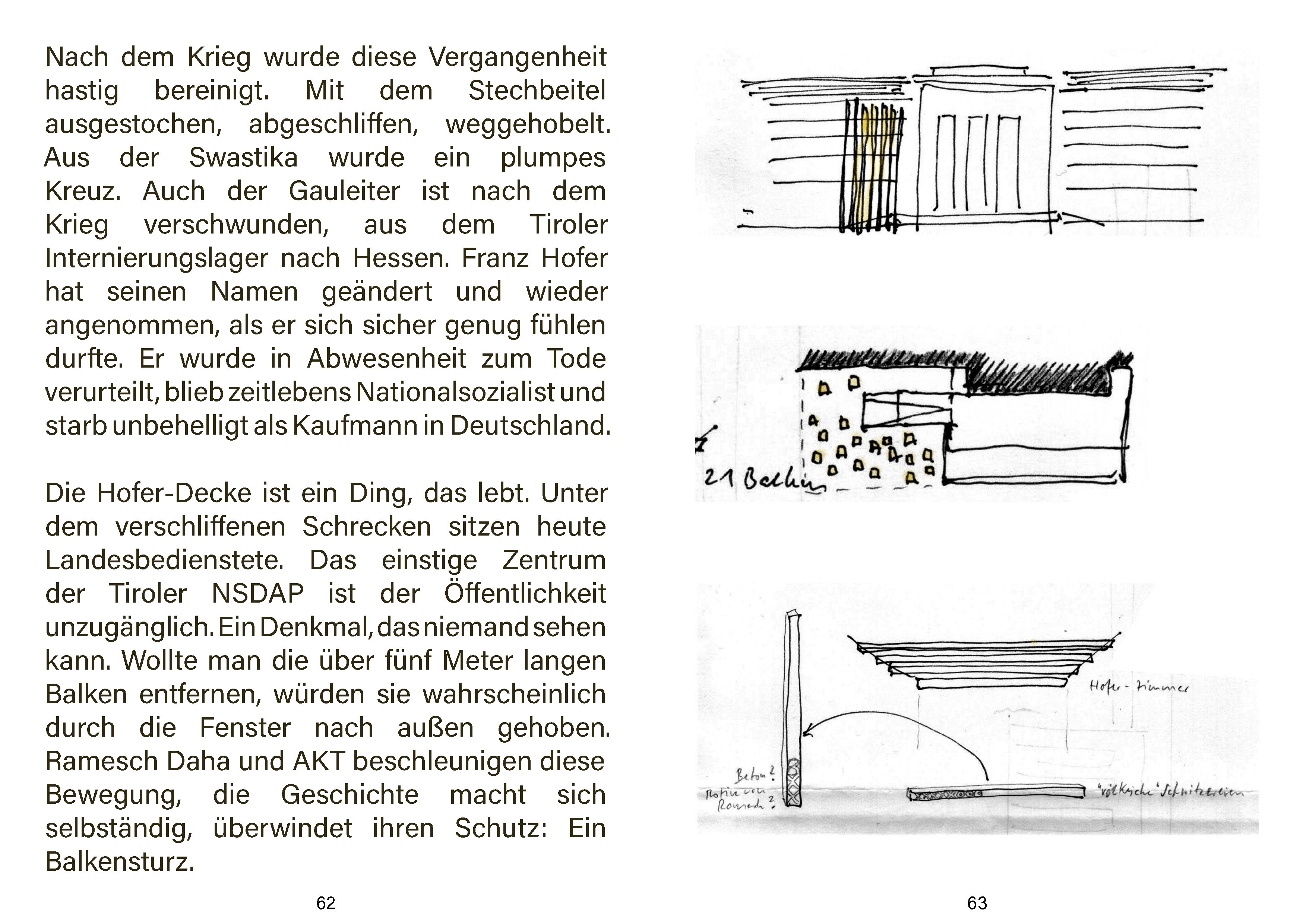Einundzwanzig Deckenbalken fallen aus dem ehemaligen Arbeitszimmer des NSDAP-Gauleiters von Tirol und Vorarlberg, Franz Hofer. Nicht die echten, sondern neue: Eine Verdoppelung. Was nicht sichtbar sein sollte, wird in die Öffentlichkeit gestellt. Unter die Menschen, die sich hindurch bewegen können. Schräg stecken die falschen Balken im Platz vor der Fassade des Neuen Landhauses. Sie zeigen auf den Raum, aus dem sie kommen, wo sie noch sind: Das Hofer-Zimmer im ersten Stock. Dort residierte Hofer von 1939-1945 und zeichnete verantwortlich für unzählige Verbrechen.