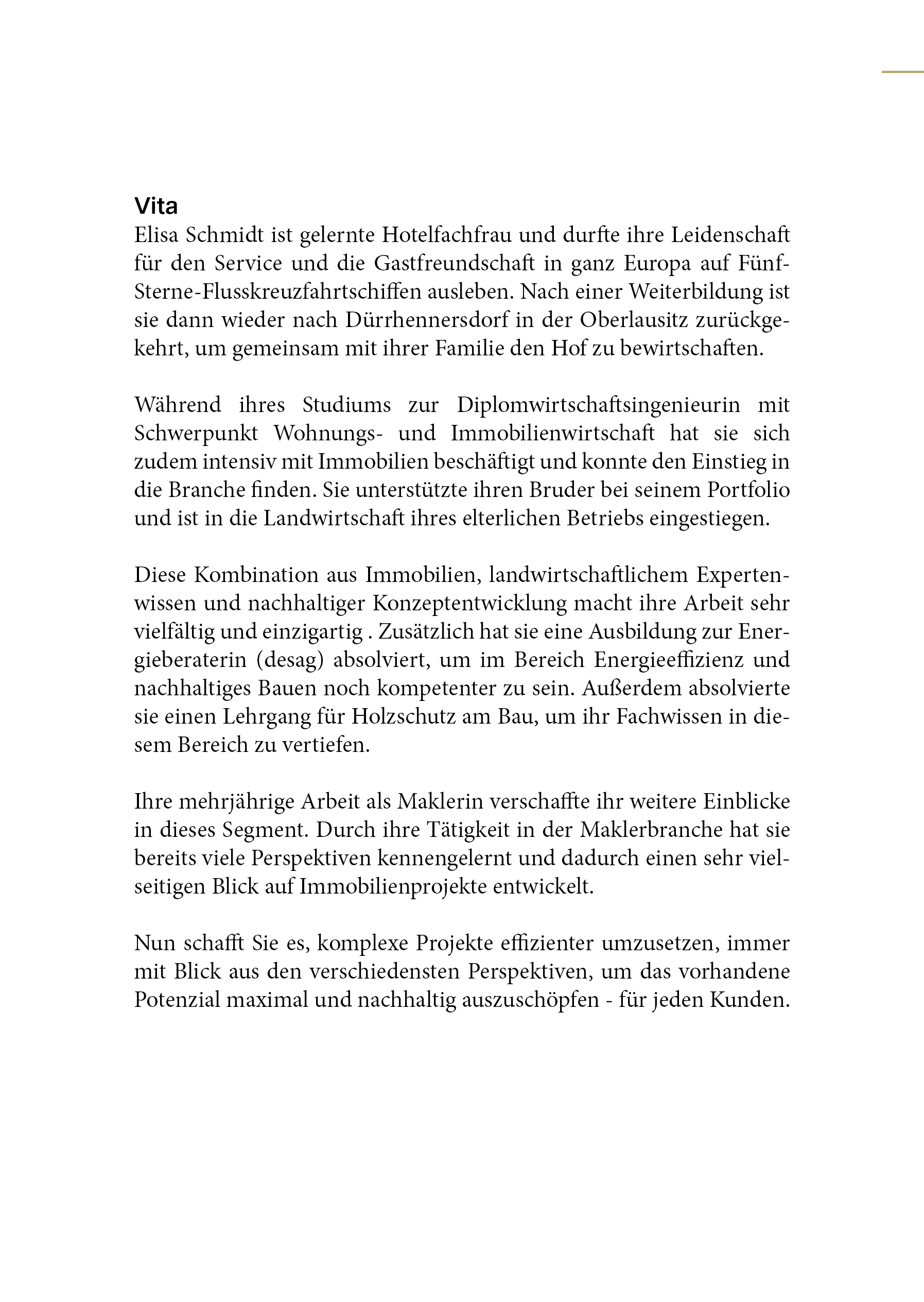 Diplom-Wirtschaftsingenieurin für Wohnungs- und Immobilienwirtschaft Elisa Schmidt: Strategieberatung rund um Immobilien (Schwerpunkt Besichtigungen und Onlineberatung) ✨ Immobilienbewertung ✨ Unterstützung Agrarförderung ✨ "Hi, ich bin Elisa! Ich komme aus der wunderschönen Oberlausitz und lebe mit meiner Familie auf einem traditionellen Drei-Seiten-Hof. Hier, umgeben von Natur und handfester Arbeit, hat sich mein Blick auf Immobilien und nachhaltige Lösungen geschärft. Das Beste, was mir passieren konnte? Mein Studium zur Diplom-Wirtschaftsingenieurin für Wohnungs- & Immobilienwirtschaft (FH Zittau/Görlitz). Dort habe ich gelernt, wirtschaftliche, rechtliche und ingenieurtechnische Aspekte miteinander zu verbinden – eine Vielseitigkeit, die mich bis heute in meiner Arbeit begleitet. Mein Ansatz? Ich sehe das große Ganze und die kleinen Details gleichzeitig. Denn beides bedingt sich gegenseitig – und genau das ist meine Stärke. Ich bin eine Generalistin – eine sogenannte Scanner-Persönlichkeit oder, wie manche sagen, „ein wandelndes Lexikon“. Ich liebe es, Wissen zu verknüpfen, Zusammenhänge zu verstehen und aus verschiedenen Blickwinkeln zu analysieren."
