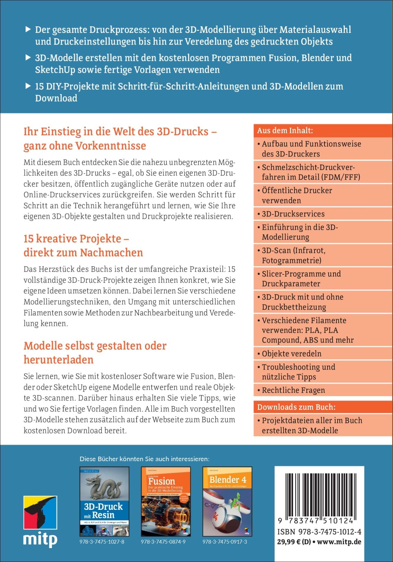 Sie lernen, wie Sie mit kostenloser Software wie Fusion, Blender oder SketchUp eigene Modelle entwerfen und reale Objekte 3D-scannen. Darüber hinaus erhalten Sie viele Tipps, wie und wo Sie fertige Vorlagen finden. Alle im Buch vorgestellten 3D-Modelle stehen zusätzlich auf der Webseite zum Buch zum kostenlosen Download bereit.