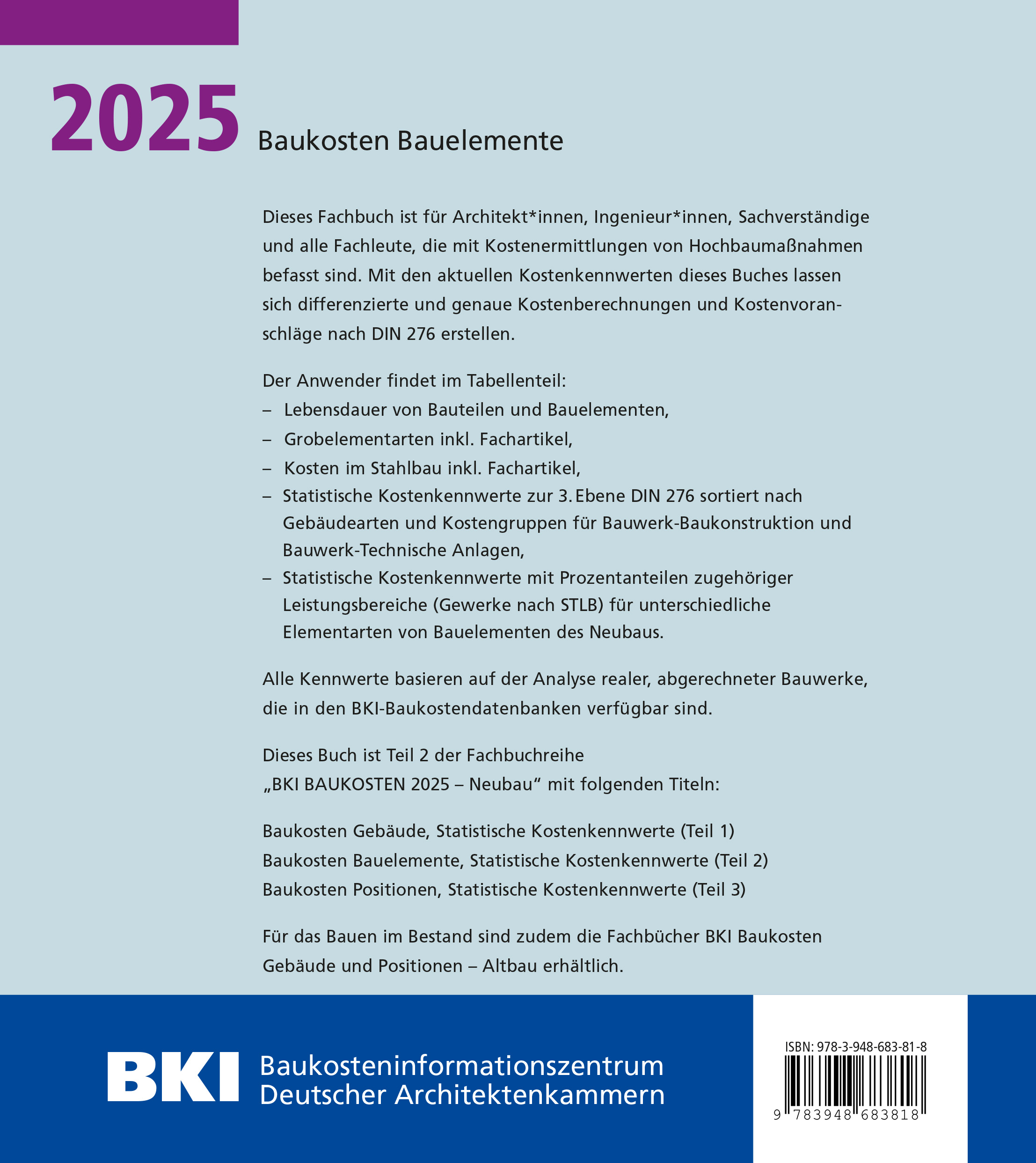 | Schlagworte | Aktuelle DIN 276 • Architektur • Ausführungsarten • Baukosten • Grobelemente • Hochbau • Kostenkennwerte • Planungskennzahlen • Stahlbau • Statistik |