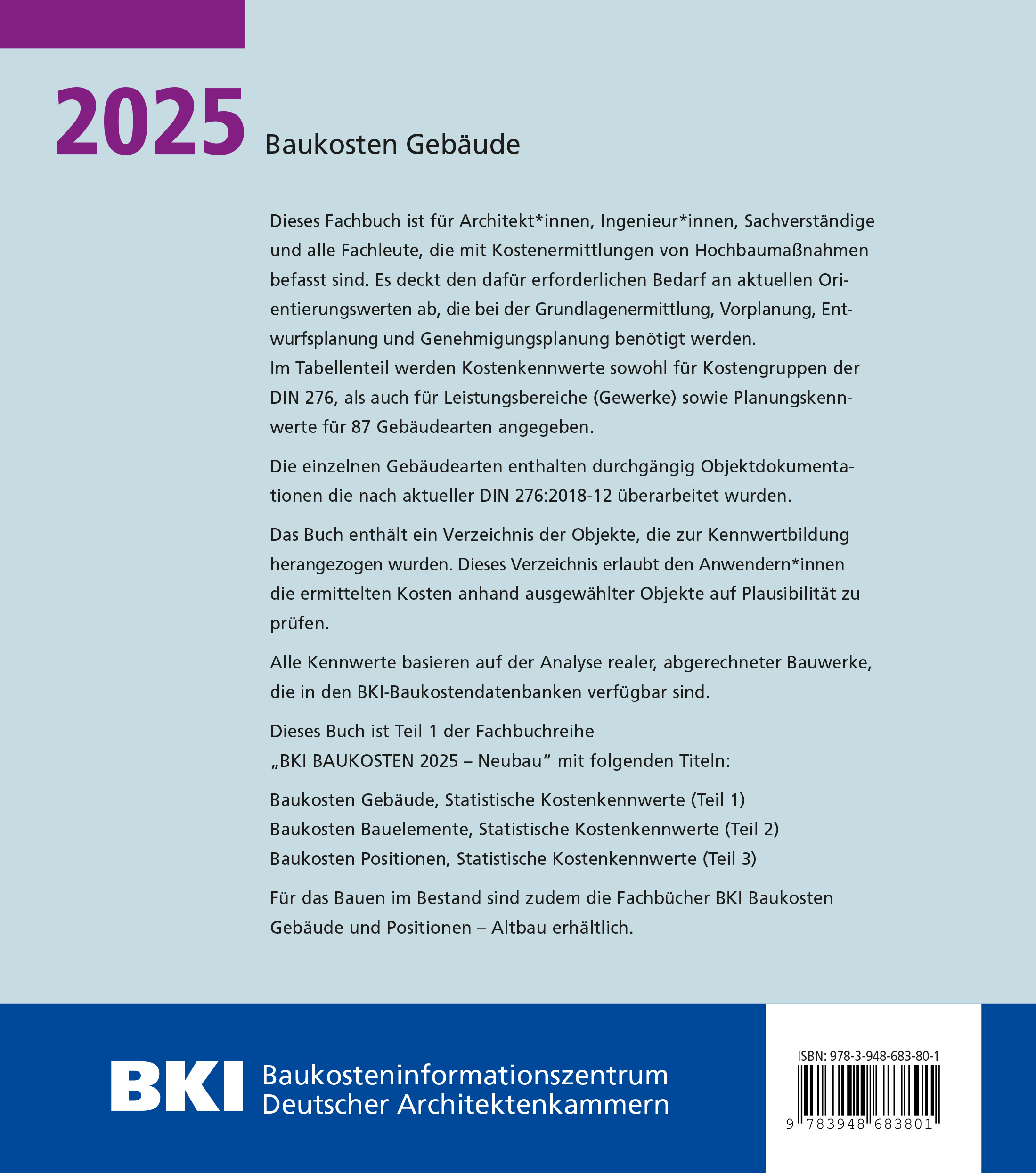 | Schlagworte | Aktuelle DIN 276 • Architektur • Baukosten • Baunebenkosten • Bauzeit-Angaben • Hochbau • Leistungsbereiche • Normalherstellungskosten • Planungskennzahlen • Statistische Kostenkennwerte |