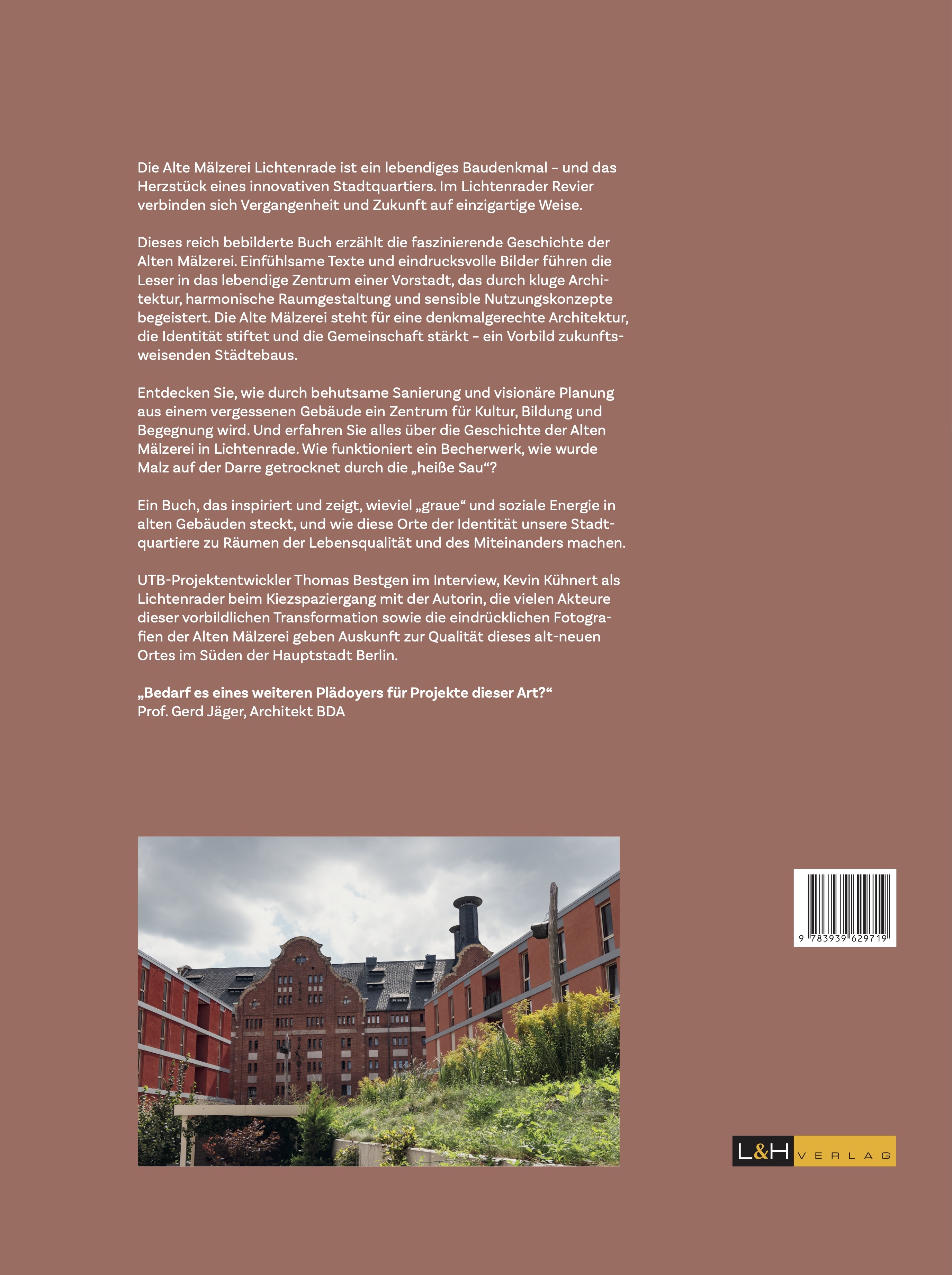 Entdecken Sie, wie durch behutsame Sanierung und visionäre Planung aus einem vergessenen Gebäude ein Zentrum für Kultur, Bildung und Begegnung wird. Und erfahren Sie alles über die Geschichte der Alten Mälzerei in Lichtenrade. Wie funktioniert ein Becherwerk, wie wurde Malz auf der Darre getrocknet durch die „heiße Sau“? Ein Buch, das inspiriert und zeigt, wie viel „graue“ und soziale Energie in alten Gebäuden steckt, und wie diese Orte der Identität unsere Stadtquartiere zu Räumen der Lebensqualität und des Miteinanders machen. UTB-Projektentwickler Thomas Bestgen im Interview, Kevin Kühnert als Lichtenrader beim Kiezspaziergang mit der Autorin, die vielen Akteure dieser vorbildlichen Transformation sowie die eindrücklichen Fotografien der Alten Mälzerei geben Auskunft zur Qualität dieses alt-neuen Ortes im Süden der Hauptstadt Berlin.