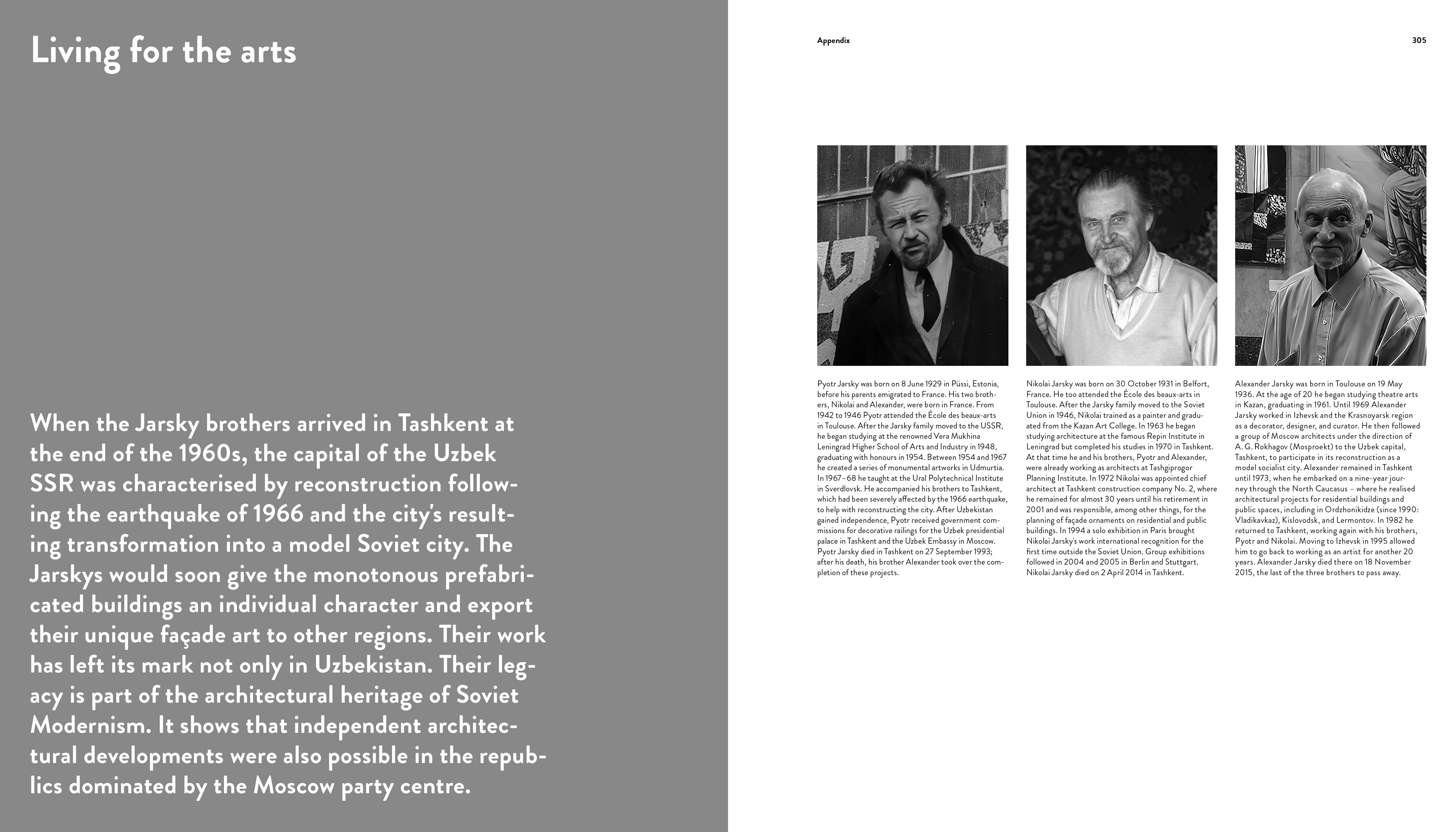 This book documents for the first time the life and work of the Jarsky brothers, whose mosaic murals now number among Uzbekistan’s officially protected cultural assets. Based on two decades of research and rare personal encounters with the Jarsky family, it presents an architectural history written not by ministries but by hands shaping tiles – and identities – into lasting form.