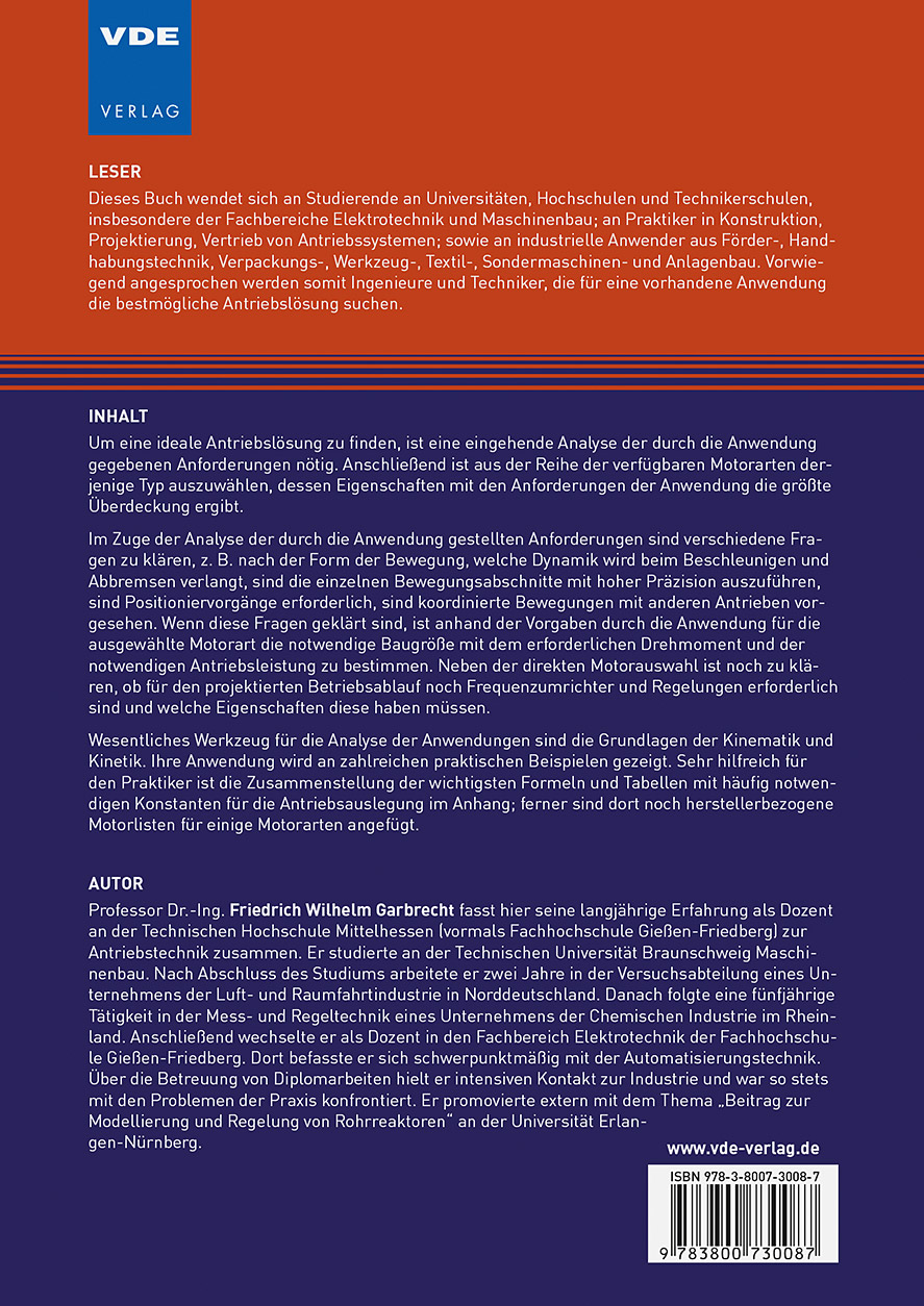 Prof. Dr.-Ing. Friedrich Wilhelm Garbrecht fasst hier seine langjährige Erfahrung als Dozent an der Technischen Hochschule Mittelhessen (vormals Fachhochschule Gießen-Friedberg) zur Antriebstechnik zusammen. Weitere Schwerpunkte seiner Tätigkeit waren Regelungstechnik und Elektronik.