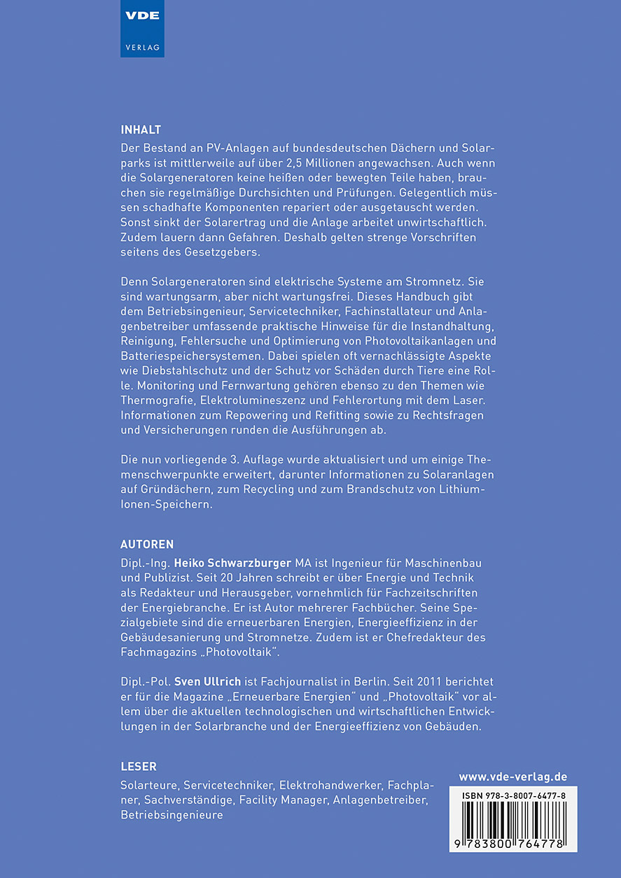 Denn Solargeneratoren sind elektrische Systeme am Stromnetz. Sie sind wartungsarm, aber nicht wartungsfrei. Dieses Handbuch gibt dem Betriebsingenieur, Servicetechniker, Fachinstallateur und Anlagenbetreiber umfassende praktische Hinweise für die Instandhaltung, Reinigung, Fehlersuche und Optimierung von Photovoltaikanlagen und Batteriespeichersystemen. Dabei spielen oft vernachlässigte Aspekte wie Diebstahlschutz und der Schutz vor Schäden durch Tiere eine Rolle. Monitoring und Fernwartung gehören ebenso zu den Themen wie Thermografie, Elektrolumineszenz und Fehlerortung mit dem Laser. Informationen zum Repowering und Refitting sowie zu Rechtsfragen und Versicherungen runden die Ausführungen ab.