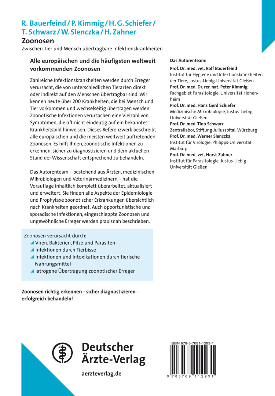 Heute sind über 200 Krankheiten bekannt, die bei Mensch und Tier vorkommen und wechselseitig übertragen werden. Das Referenzwerk beschreibt alle europäischen und die meisten weltweit auftretenden Zoonosen. Auch opportunistische und sporadische Infektionen, eingeschleppte Zoonosen und ungewöhnliche Erreger werden praxisnah beschrieben.