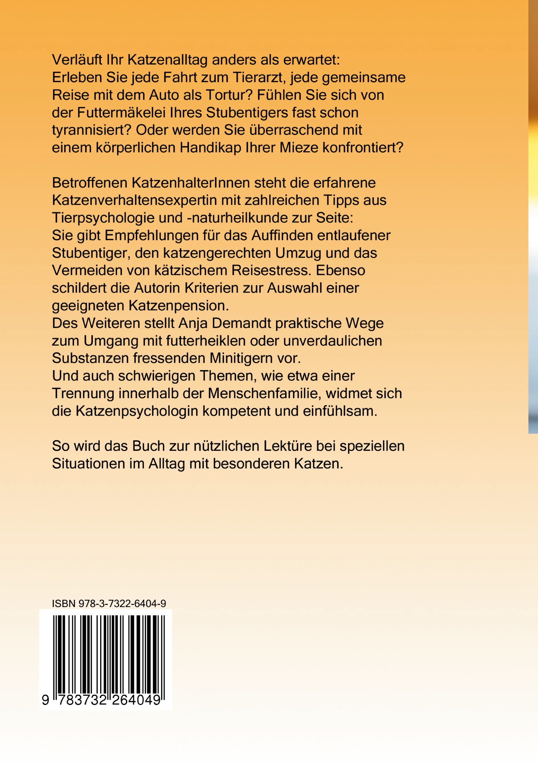 Verläuft Ihr Katzenalltag anders als erwartet: Erleben Sie jede Fahrt zum Tierarzt, jede gemeinsame Reise mit dem Auto als Tortur? Fühlen Sie sich von der Futtermäkelei Ihres Stubentigers fast schon tyrannisiert? Oder werden Sie überraschend mit einem körperlichen Handikap Ihrer Mieze konfrontiert? Betroffenen KatzenhalterInnen steht die erfahrene Katzenverhaltensexpertin mit zahlreichen Tipps zur Seite: Sie gibt Empfehlungen für das Vermeiden von kätzischem Reisestress, das Auffinden entlaufener Stubentiger und den katzengerechten Umzug. Ebenso schildert die Autorin Kriterien zur Auswahl einer geeigneten Katzenpension. Des Weiteren stellt Anja Demandt praktische Wege zum Umgang mit futterheiklen oder unverdaulichen Substanzen fressenden Minitigern vor. Und auch schwierigen Themen, wie etwa einer Trennung innerhalb der Menschenfamilie, widmet sich die Katzenpsychologin kompetent und einfühlsam. Neben Erkenntnissen aus der Tierpsychologie informiert die Katzenexpertin zu jedem Verhaltensthema auch über geeignete Unterstützung aus den Komplementärbereichen Naturdüfte, Bachblüten und Schüßlersalze. 40 farbige Abbildungen veranschaulichen die Erläuterungen. So wird das Buch zur nützlichen Lektüre bei speziellen Situationen im Alltag mit besonderen Katzen.