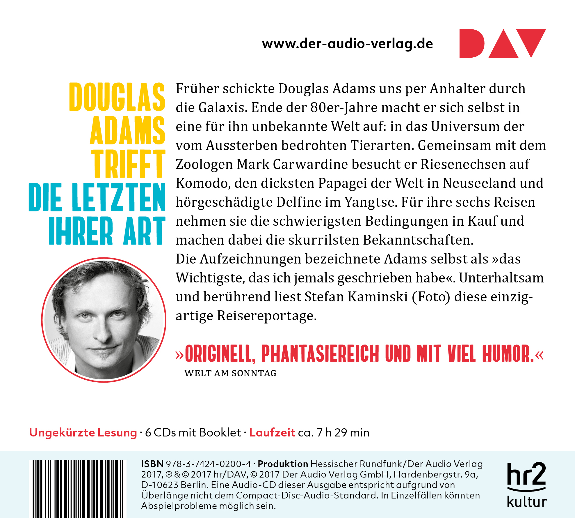 Früher schickte Douglas Adams seine Hörer per Anhalter durch die Galaxis. Ende der 80er-Jahre macht er sich selbst in eine für ihn unbekannte Welt auf: in das Universum der vom Aussterben bedrohten Tierarten. Gemeinsam mit dem Zoologen Mark Carwardine besucht er Riesenechsen auf Komodo, den dicksten Papagei der Welt in Neuseeland und hörgeschädigte Delfine im Yangtse. Für ihre sechs Reisen nehmen sie die schwierigsten Bedingungen in Kauf und machen dabei die skurrilsten Bekanntschaften. Die Reportagen bezeichnete Adams selbst als »das Wichtigste, das ich jemals geschrieben habe«.