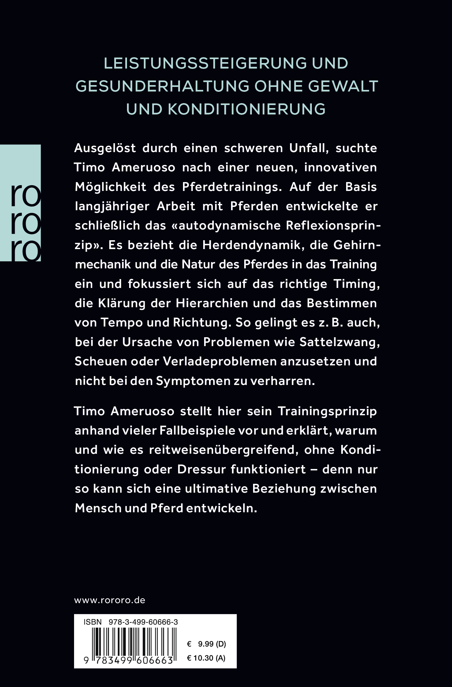 Timo Ameruoso, (Jahrgang 1978) fing mit acht Jahren mit dem Reitsport an. Ein Motorradunfall beendete seine vielversprechende Reit-Karriere. Nach weiteren Schicksalsschlägen baute er sein eigenes Unternehmen als Pferdemediator auf. Inzwischen gibt Timo Ameruoso sein Wissen in weltweiten Seminaren weiter. Er ist Dozent an der einzigen Pferdeuniversität der Welt und überträgt seine Erfahrungen in Vorträgen und Workshops für Unternehmen.