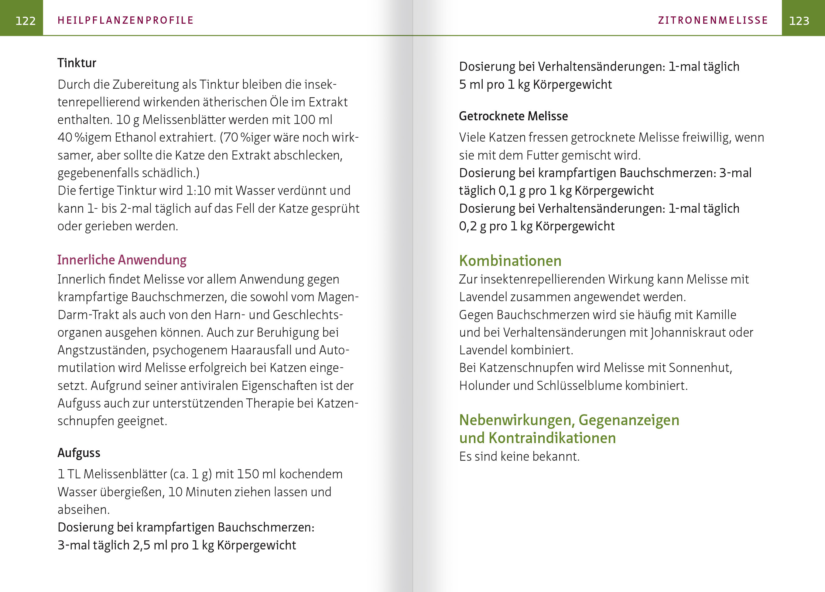 ((Auszug aus dem Kapitel "Basiswissen Katzen"))KATZEN UND KRÄUTER - GEHT DAS ÜBERHAUPT?Jeder Katzenbesitzer ist vermutlich schon einmal am anspruchsvollen Geschmackssinn seiner Katze verzweifelt. Es gibt Samtpfoten, denen für jede Mahlzeit eine andere Futtersorte angeboten werden muss, sonst treten sie in den Hungerstreik. Wiederum andere ziehen es vor, jeden Tag exakt dasselbe Futter zu erhalten, und verweigern bereits bei Anbruch einer neuen Charge das Fressen. Am schlimmsten ist es, wenn man versucht, ihnen Arzneimittel zu verabreichen. Jedes noch so geschickte Versteck in Butter oder Streichwurst scheint entdeckt zu werden, und die Leckerei wird entweder komplett verschmäht oder die Tablette säuberlich abgeschleckt ausgespuckt.Wie soll man denn in unsere Katzen Heilkräuter hineinbringen, die meistens extrem bitter schmecken, wenn sie sich bereits bei nach Fleisch oder Vanille schmeckenden Fertigarzneimitteln schon so anstellen?Die Antwort ist überraschend einfach: Viele Katzen nehmen im Krankheitsfall Kräuter freiwillig auf. Dafür verantwortlich sind zwei Mechanismen, die sogenannte Bitterstofftoleranz und die Fähigkeit zur Selbstmedikation.---WICHTIG: Katzen haben einen besonderen Stoffwechsel und benötigen daher spezielle Dosierungen von Arzneimitteln und Heilpflanzen. Es ist nicht möglich, die Dosierung von Hunden oder Menschen einfach auf das entsprechende Körpergewicht umzurechnen.---BITTERSTOFFTOLERANZBitterstoffe (Tannine) sind in der Pflanzenwelt häufig ein Zeichen für Giftigkeit und werden deshalb von den meisten Tieren gemieden. An kranken Wildtieren, z. B. Hirschen und Affen, hat man jedoch beobachtet, dass diese im Krankheitsfall auch bittere Pflanzen zu sich nehmen. Die Beobachtungen an Wildtieren hat man zum Anlass genommen, um die Bitterstofftoleranz bei Mäusen, Wiederkäuern, Menschen und anderen Säugetieren experimentell zu untersuchen. Es zeigte sich, dass im Krankheitsfall Bitterstoffe nicht nur in höherem Maße akzeptiert, sondern bei Tieren auch gezielt verzehrt wurden. Auch Katzen haben im Krankheitsfall eine erhöhte Bitterstofftoleranz.FÄHIGKEIT ZUR SELBSTMEDIKATIONUnter Selbstmedikation verstehen wir die im Krankheitsfall gezielte Aufnahme von Substanzen, die nicht zum normalen Nahrungsspektrum einer Tierart gehören und deren Konsum zu einer Heilung oder Symptomlinderung führt. Dies kann bei wild lebenden Tieren immer wieder beobachtet werden. Zum Beispiel fressen Nashörner mit starkem Durchfall große Mengen der adstringierenden Mangrovenrinde. Auch bei wild lebenden Tigern ist die Fähigkeit zur Selbstmedikation schon beobachtet worden: Bei starkem Wurmbefall fressen sie gezielt größere Mengen unverdauliches Gras, welches sich um die im Darm lebenden Würmer wickelt, sodass diese mit dem Kot ausgeschieden werden.Die grundsätzliche Fähigkeit zur Selbstmedikation ist auch in unseren Hauskatzen noch erhalten. Immer wieder beobachten wir, dass unsere Katzen bei Übelkeit große Mengen Gras fressen, welches anschließend inklusive der Übelkeit auslösenden Ursache erbrochen wird. Wenn Sie Ihre Katze mit Heilpflanzen behandeln, werden Sie erleben, dass die Fähigkeit zur Selbstmedikation Ihrer Katze sich nicht nur auf Gras und Erbrechen beschränkt. Viele, aber leider nicht alle Katzen wissen instinktiv, ob und wie lange sie ein Arzneimittel oder eine Heilpflanze wirklich benötigen.