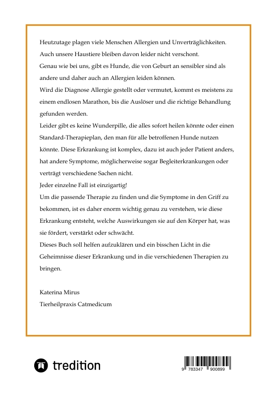 Heutzutage plagen viele Menschen Allergien und Unverträglichkeiten. Auch unsere Haustiere bleiben davon leider nicht verschont. Genau wie bei uns, gibt es Hunde, die von Geburt an sensibler sind als andere und daher auch an Allergien leiden können.Wird die Diagnose Allergie gestellt oder vermutet, kommt es meistens zu einem endlosen Marathon, bis die Auslöser und die richtige Behandlung gefunden werden.Leider gibt es keine Wunderpille, die alles sofort heilen könnte oder einen Standard-Therapieplan, den man für alle betroffenen Hunde nutzen könnte. Diese Erkrankung ist komplex, dazu ist auch jeder Patient anders, hat andere Symptome, möglicherweise sogar Begleiterkrankungen oder verträgt verschiedene Sachen nicht. Jeder einzelne Fall ist also einzigartig!Um die passende Therapie zu finden und die Symptome in den Griff zu bekommen, ist es daher enorm wichtig genau zu verstehen, wie diese Erkrankung entsteht, welche Auswirkungen sie auf den Körper hat, was sie fördert, verstärkt oder schwächt.Dieses Buch soll helfen aufzuklären und ein bisschen Licht in die Geheimnisse dieser Erkrankung und in die verschiedenen Therapien zu bringen.