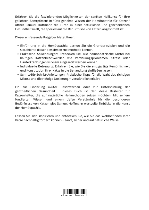 Erfahren Sie die faszinierenden Möglichkeiten der sanften Heilkunst für Ihre geliebten Samtpfoten! In "Das geheime Wissen der Homöopathie für Katzen" öffnet Samuel Hoffmann die Türen zu einer natürlichen und ganzheitlichen Gesundheitswelt, die speziell auf die Bedürfnisse von Katzen abgestimmt ist.Dieser umfassende Ratgeber bietet Ihnen:Einführung in die Homöopathie: Lernen Sie die Grundprinzipien und die Geschichte dieser bewährten Heilmethode kennen.Praktische Anwendungen: Entdecken Sie, wie homöopathische Mittel bei häufigen Katzenbeschwerden wie Verdauungsproblemen, Stress oder Hauterkrankungen wirksam eingesetzt werden können.Individuelle Betreuung: Erfahren Sie, wie Sie die einzigartige Persönlichkeit und Konstitution Ihrer Katze in die Behandlung einfließen lassen.Schritt-für-Schritt-Anleitungen: Praktische Tipps für die Wahl des richtigen Mittels und die richtige Dosierung - verständlich erklärt.Ob zur Linderung akuter Beschwerden oder zur Unterstützung der ganzheitlichen Gesundheit - dieses Buch ist der ideale Begleiter für Katzenhalter, die auf natürliche Heilmethoden setzen möchten. Mit seinem fundierten Wissen und einem tiefen Verständnis für die besonderen Bedürfnisse von Katzen gibt Samuel Hoffmann wertvolle Einblicke in die Kunst der Homöopathie.Lassen Sie sich inspirieren und entdecken Sie, wie Sie das Wohlbefinden Ihrer Katze nachhaltig fördern können - sanft, sicher und auf natürliche Weise!