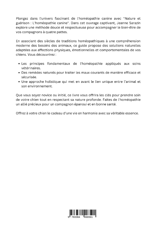 Plongez dans l'univers fascinant de l'homéopathie canine avec "Nature et guérison : L'homéopathie canine". Dans cet ouvrage captivant, Jeanne Sarazin explore une méthode douce et respectueuse pour accompagner le bien-être de vos compagnons à quatre pattes.En associant des siècles de traditions homéopathiques à une compréhension moderne des besoins des animaux, ce guide propose des solutions naturelles adaptées aux affections physiques, émotionnelles et comportementales de vos chiens. Vous découvrirez :Les principes fondamentaux de l'homéopathie appliqués aux soins vétérinaires.Des remèdes naturels pour traiter les maux courants de manière efficace et sécurisée.Une approche holistique qui met en avant le lien unique entre l'animal et son environnement.Que vous soyez novice ou initié, ce livre vous offrira les clés pour prendre soin de votre chien tout en respectant sa nature profonde. Faites de l'homéopathie un allié précieux pour un compagnon épanoui et en bonne santé.Offrez à votre chien le cadeau d'une vie en harmonie avec sa véritable essence.
