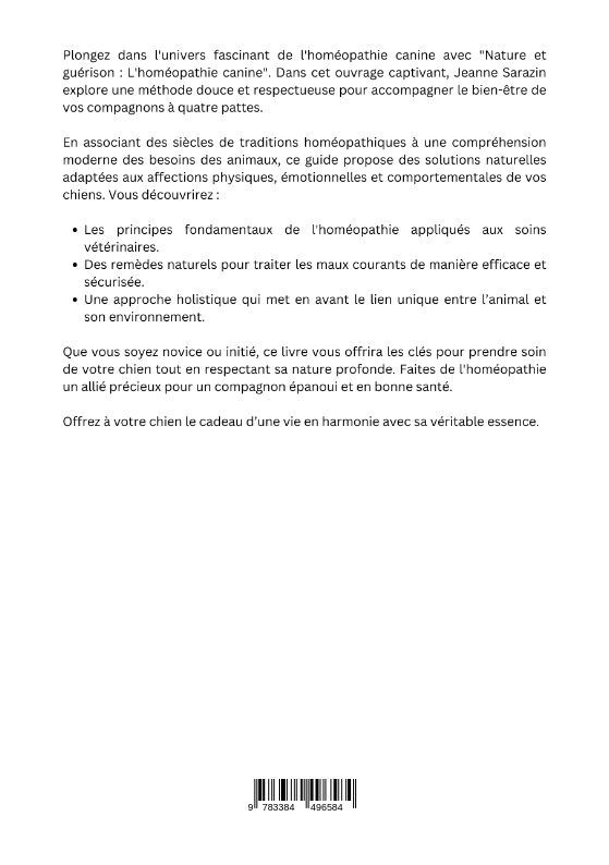 Plongez dans l'univers fascinant de l'homéopathie canine avec "Nature et guérison : L'homéopathie canine". Dans cet ouvrage captivant, Jeanne Sarazin explore une méthode douce et respectueuse pour accompagner le bien-être de vos compagnons à quatre pattes.En associant des siècles de traditions homéopathiques à une compréhension moderne des besoins des animaux, ce guide propose des solutions naturelles adaptées aux affections physiques, émotionnelles et comportementales de vos chiens. Vous découvrirez :Les principes fondamentaux de l'homéopathie appliqués aux soins vétérinaires.Des remèdes naturels pour traiter les maux courants de manière efficace et sécurisée.Une approche holistique qui met en avant le lien unique entre l'animal et son environnement.Que vous soyez novice ou initié, ce livre vous offrira les clés pour prendre soin de votre chien tout en respectant sa nature profonde. Faites de l'homéopathie un allié précieux pour un compagnon épanoui et en bonne santé.Offrez à votre chien le cadeau d'une vie en harmonie avec sa véritable essence.