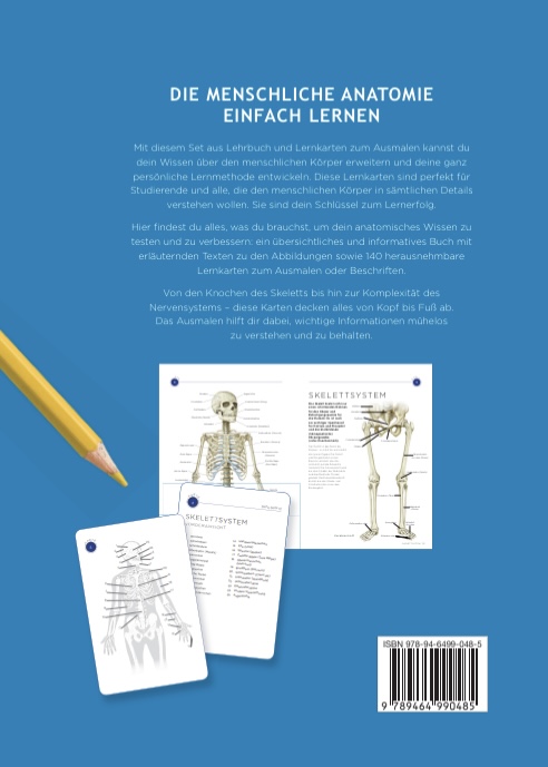 Mit diesem Set aus Lehrbuch und Lernkarten zum Ausmalen kannst du dein Wissen über den menschlichen Körper erweitern und deine ganz persönliche Lernmethode entwickeln. Diese Lernkarten sind perfekt für Studierende und alle,die den menschlichen Körper in sämtlichen Details verstehen wollen. Sie sind dein Schlüssel zum Lernerfolg. Hier findest du alles, was du brauchst, um dein anatomisches Wissen zu testen und zu verbessern: ein übersichtliches und informatives Buch mit erläuternden Texten zu den Abbildungen sowie 140 herausnehmbare Lernkarten zum Ausmalen oderBeschriften. Von den Knochen des Skeletts bis hin zur Komplexität des Nervensystems - diese Karten decken alles von Kopf bis Fuß ab. Das Ausmalen hilft dir dabei, wichtige Informationen mühelos zu verstehen und zu behalten.