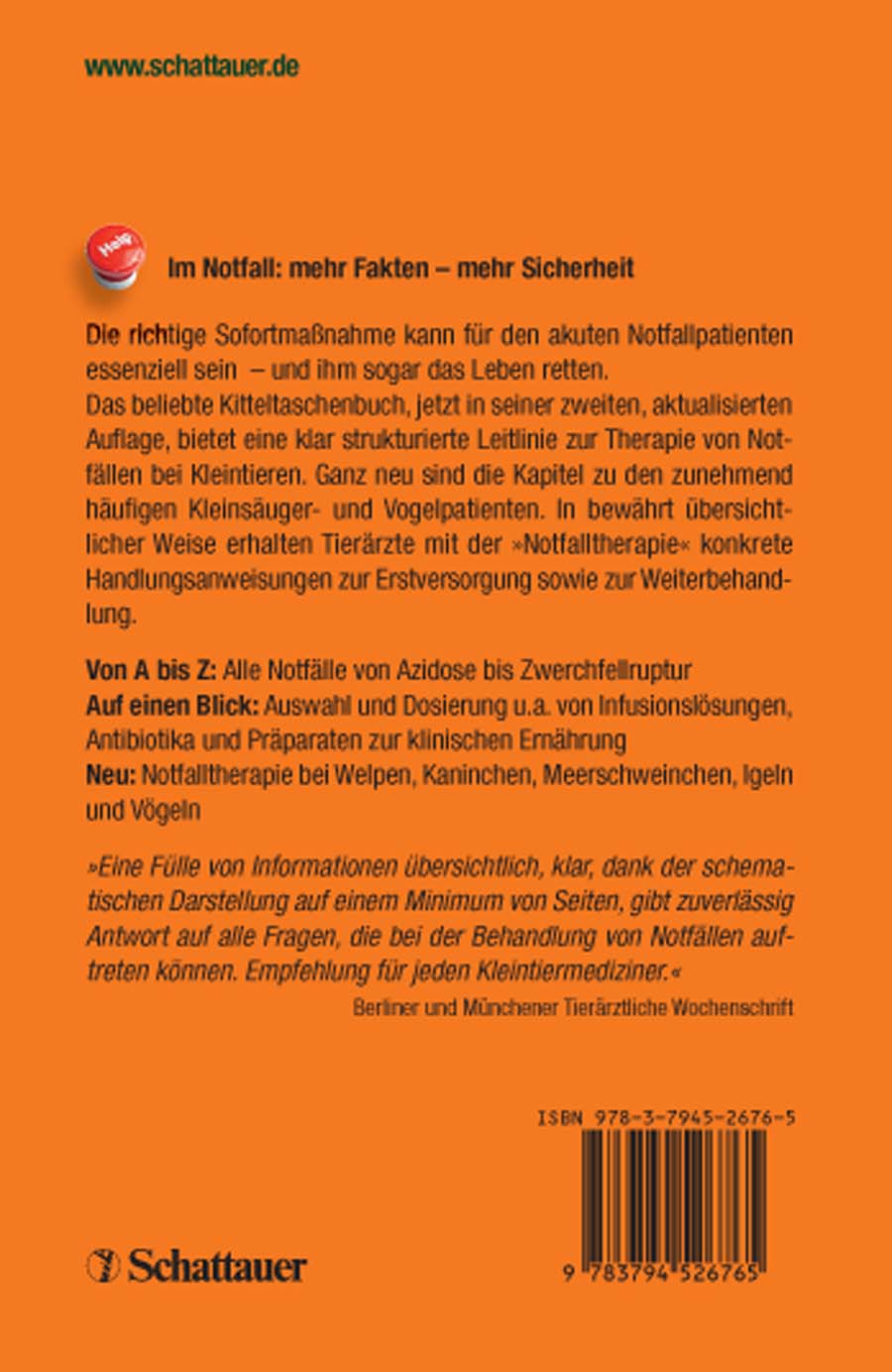 Das beliebte Kitteltaschenbuch, jetzt in seiner zweiten, aktualisierten Auflage, bietet eine klar strukturierte Leitlinie zur Therapie von Notfällen bei Kleintieren. Ganz neu sind die Kapitel zu den zunehmend häufigen Kleinsäuger- und Vogelpatienten. In bewährt übersichtlicher Weise erhalten Tierärzte mit der "Notfalltherapie" konkrete Handlungsanweisungen zur Erstversorgung sowie zur Weiterbehandlung.