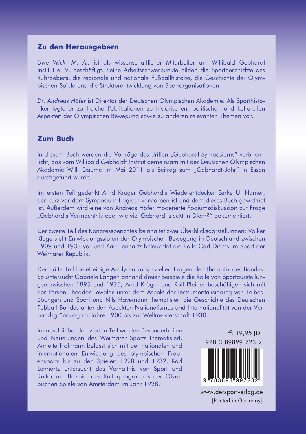 In diesem Buch werden die Vorträge des dritten "Gebhardt-Symposiums" veröffentlicht, das vom Willibald-Gebhardt-Institut gemeinsam mit der Deutschen Olympischen Akademie Willi Daume im Mai 2011 als Beitrag zum "Gebhardt-Jahr" in Essen durchgeführt wurde. Der erste Teil des Kongressberichtes beinhaltet drei Überblicksdarstellungen: die Bedeutung für die Anfänge und die Etablierung der Olympischen Bewegung in Deutschland zwischen 1895 und 1909; Entwicklungsstufen der Olympischen Bewegung in Deutschland zwischen 1909 und 1933 und die Rolle Carl Diems im Sport der Weimarer Republik.Im zweiten Teil wird die Frage nach "Gebhardts Vermächtnis oder wie viel Gebhardt steckt in Diem?" sowie der Beitrag zur Würdigung Gebhardts in der bildenden Kunst bis 1936 dokumentiert. Der dritte Teil bietet einige Analysen zu speziellen Fragen der Thematik des Bandes: So wird anhand dreier Beispiele die Rolle von Sportausstellungen zwischen 1895 und 1925 untersucht; die Person Theodor Lewalds wird unter dem Aspekt der Instrumentalisierung von Leibesübungen und Sport beleuchtet und die Geschichte des Deutschen Fußball-Bundes wird unter den Aspekten Nationalismus und Internationalität von der Verbandsgründung im Jahre 1900 bis zur Weltmeisterschaft 1930 genauer betrachtet.Im abschließenden vierten Teil werden Besonderheiten und Neuerungen des Weimarer Sports thematisiert. Die nationale und die internationale Entwicklung des olympischen Frauensports bis zu den Spielen 1928 werden ebenso wie das Verhältnis von Sport und Kultur am Beispiel des Kulturprogramms der Olympischen Spiele von Amsterdam im Jahr 1928 untersucht.
