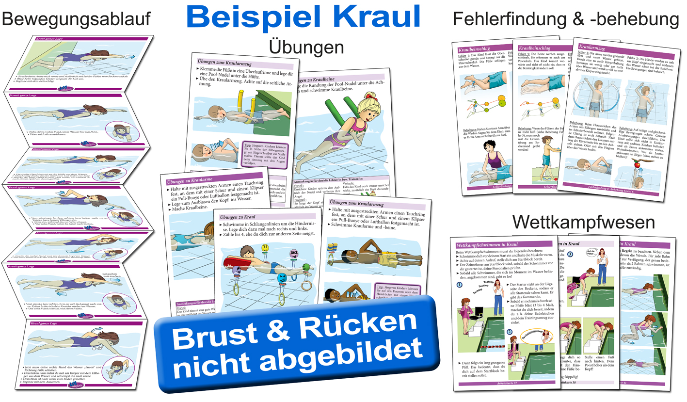 Zum Lernen der Schwimmstile Kraul, Rücken und Brust von ersten Übungen bis hin zur ganzen Lage mit vielen Beispielen. Die Karten können mit ins Wasser genommen und die Aufgaben vor Ort durchgeführt werden.